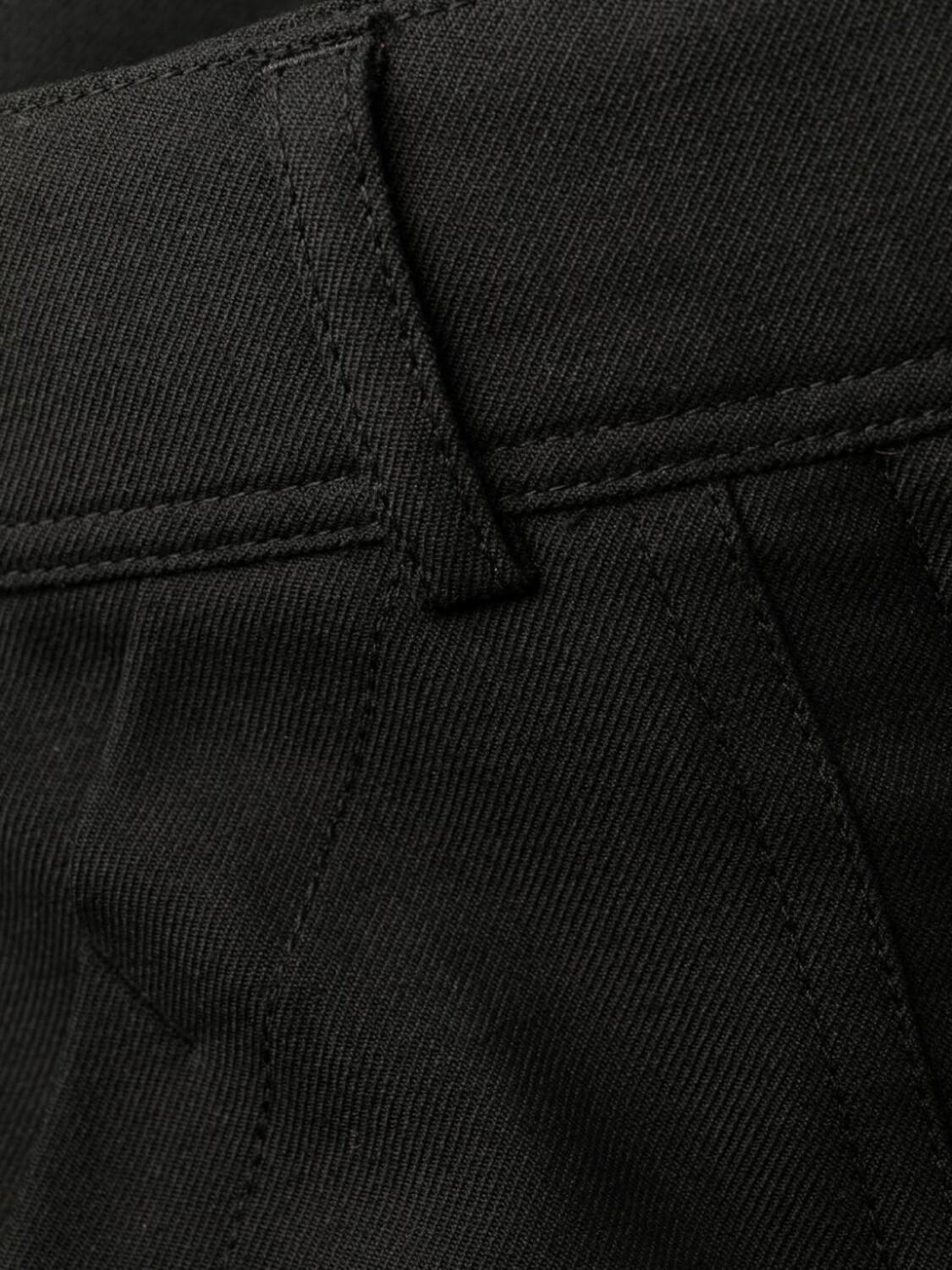 Завышенная талия, петли для ремня, накладной карман сзади, два накладных кармана спереди, строчка в тон, накладной карман сбоку, стрелки, свободный крой, прямой крой и разрез. Цвет: черный. .