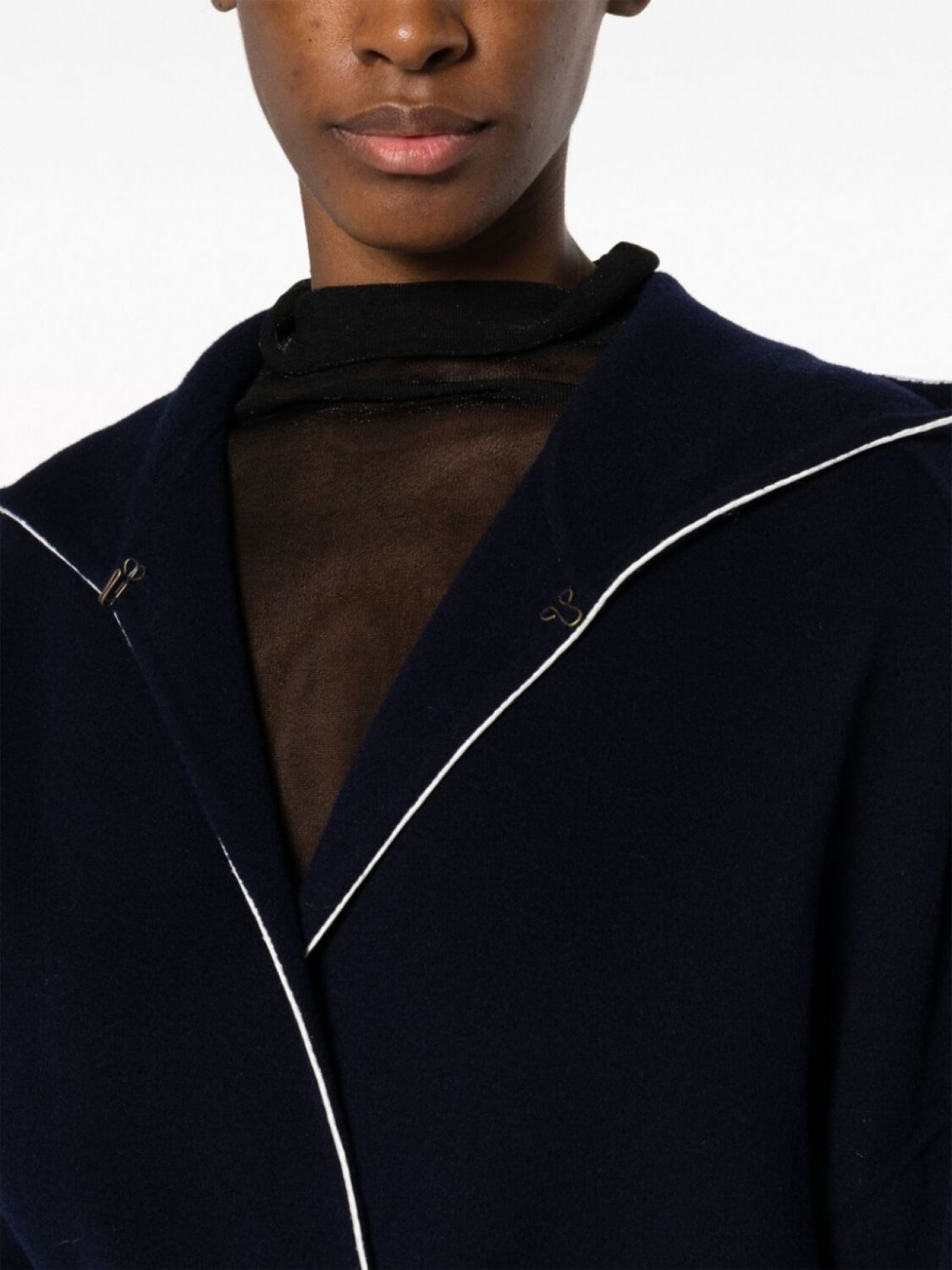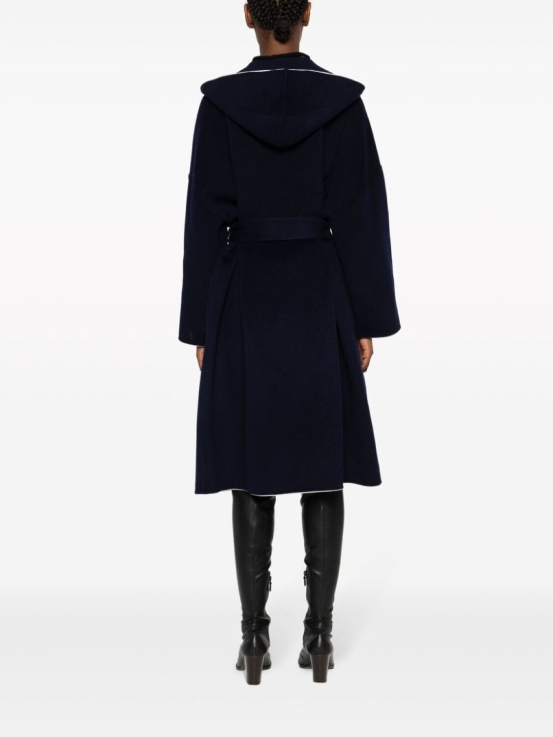 Темно-синий, шерсть, фетровый материал, контрастная отделка, золотистая фурнитура, объемный капюшон, застежка с пряжкой спереди, длинные рукава, ремень на талии, два передних кармана с клапанами, длина по колено и прямой подол.