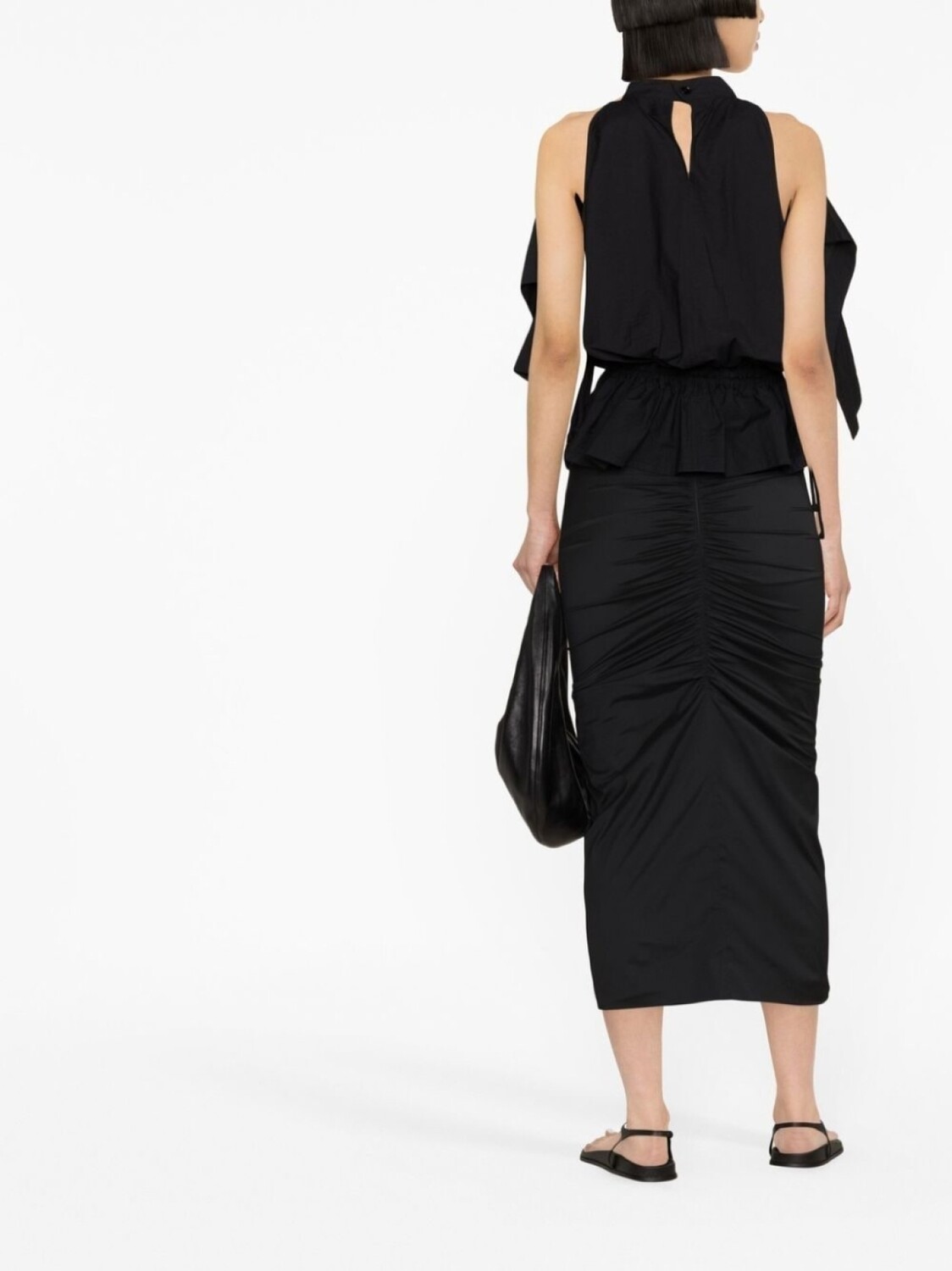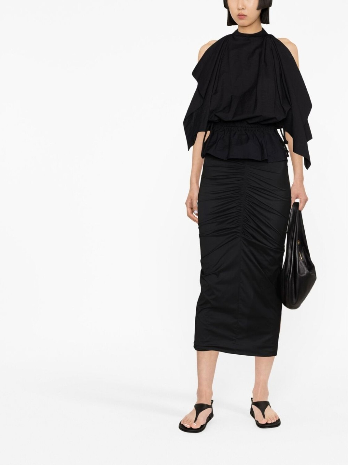 Черный, эластичный материал, дизайн со сборками, завышенная талия, обтягивающий юбка и длина миди.