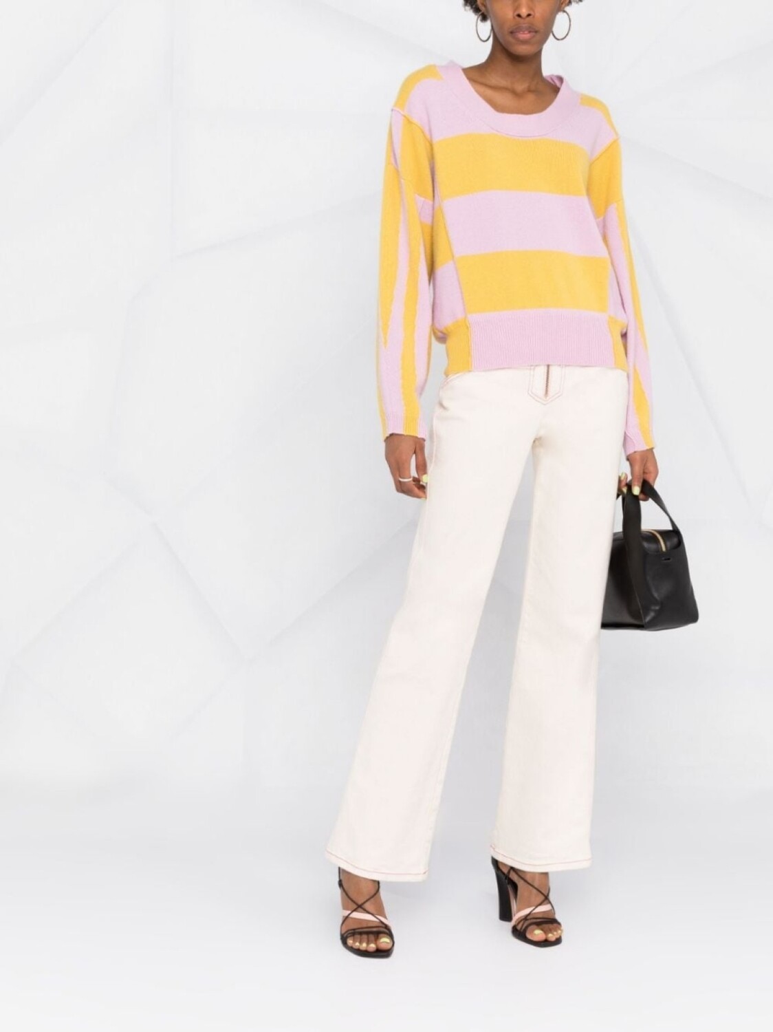 Узор в горизонтальную полоску, края в рубчик, U-образный вырез, приспущенные плечи и длинные рукава. Этот бренд получил хорошую оценку за использование этичных по отношению к животным практикам..
