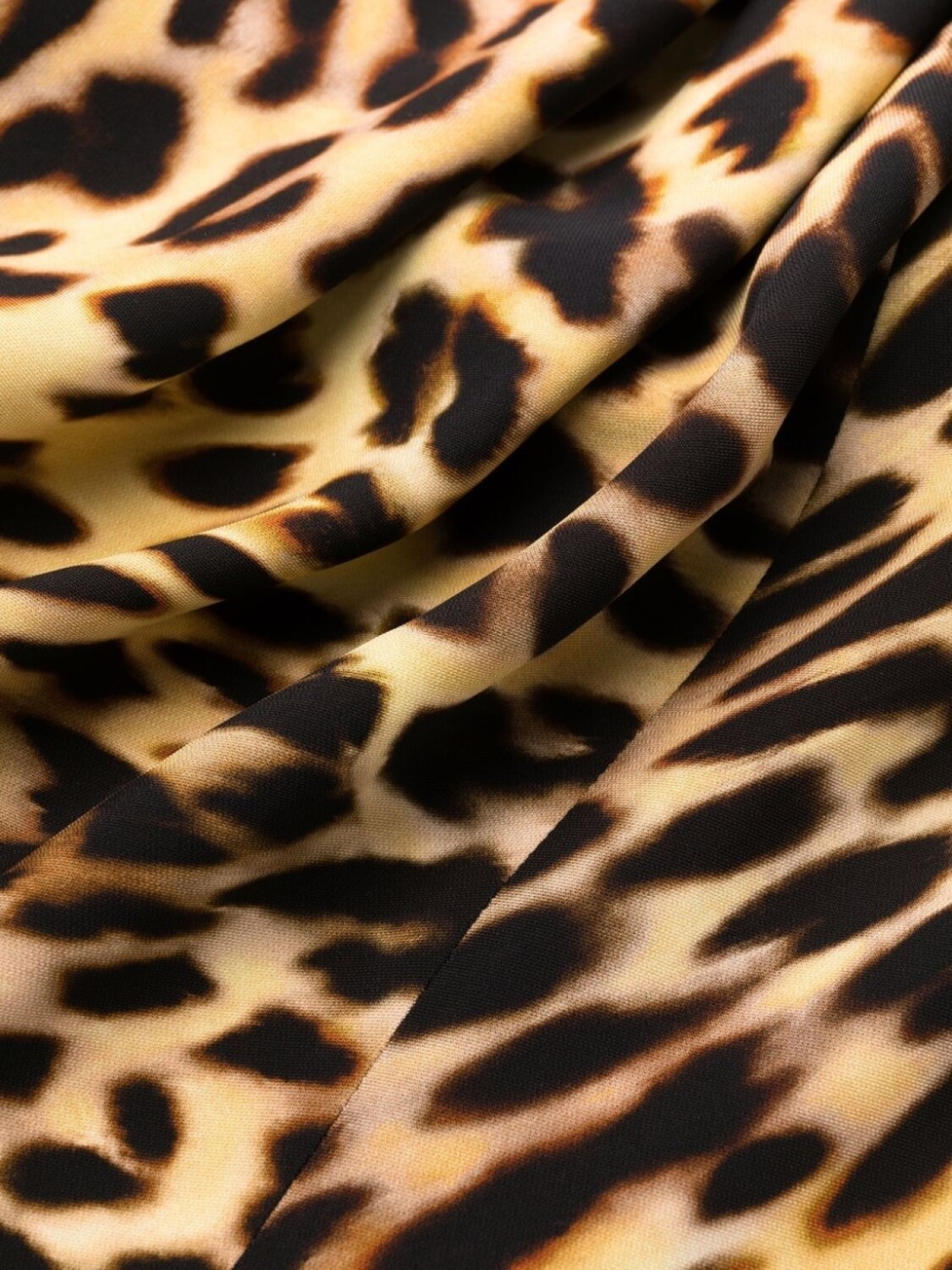 Сплошной леопардовый принт, цепочка, дизайн со сборками, круглый вырез, подплечники, короткие рукава, длина до бедер и прямой подол.