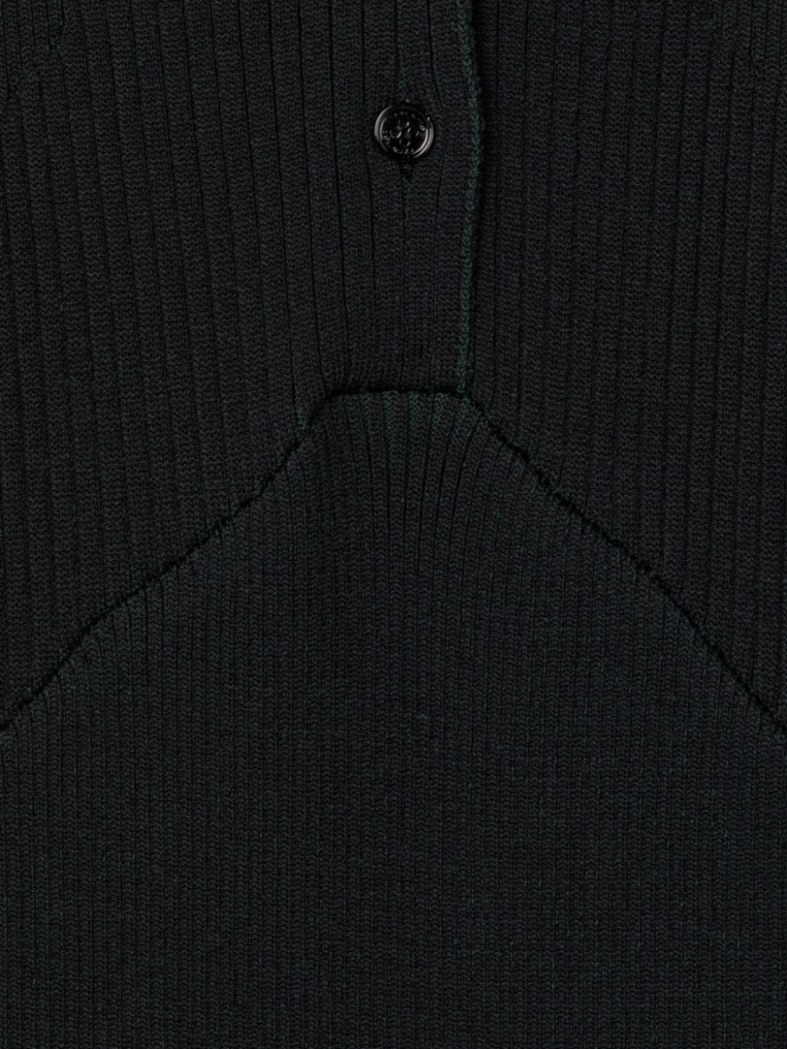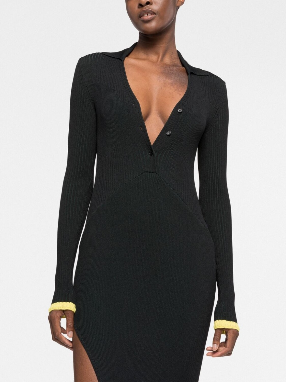 Черный, глубокий V-образный вырез, трикотаж в рубчик, планка на пуговицах спереди, отложной воротник, длинные рукава, боковой разрез, контрастная отделка и подол с фестонами.