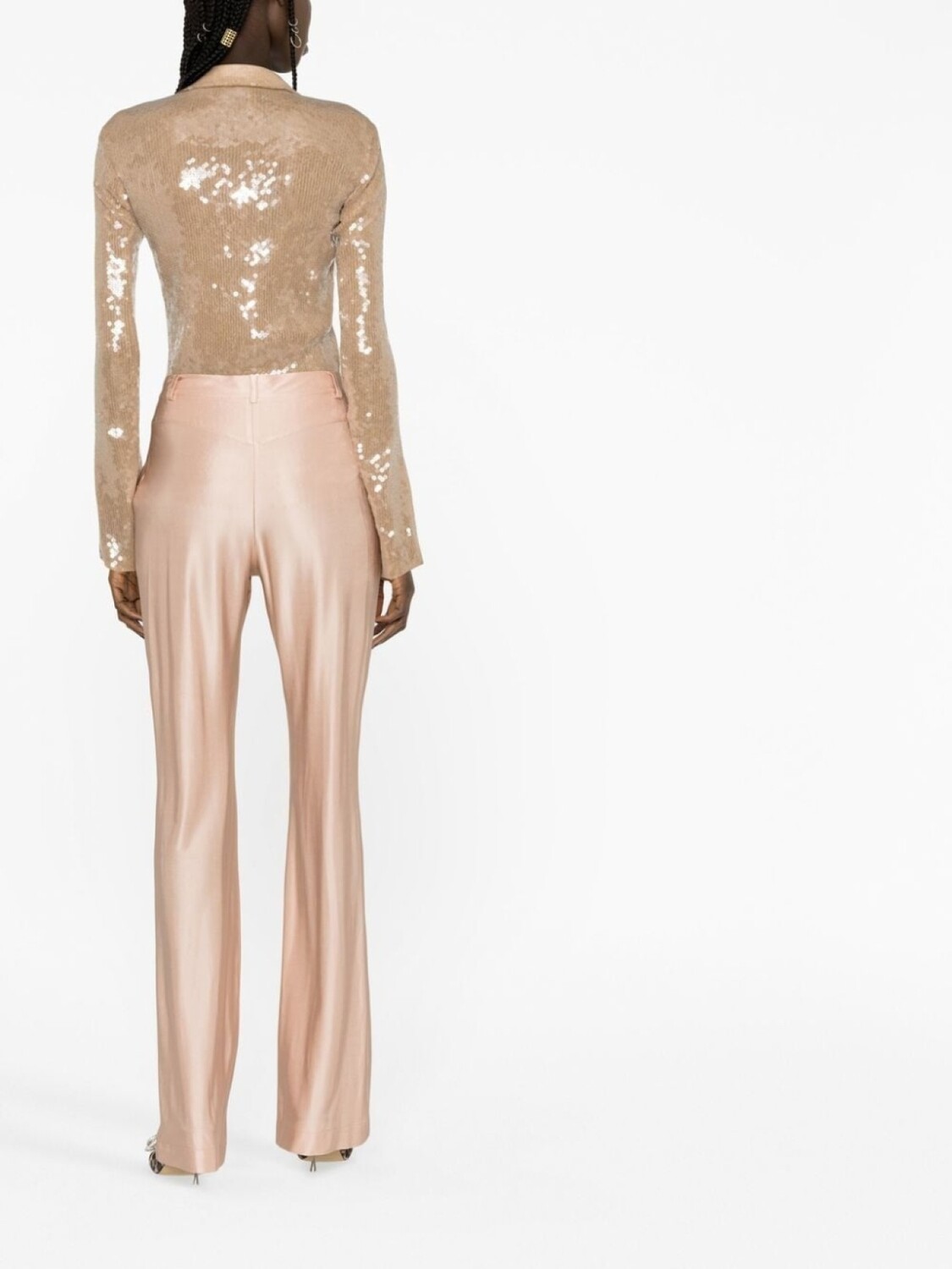 Расцветка Blush Pink, эластичный материал, сатиновая фактура, завышенная талия, петли для ремня, два кармана по бокам и прямой крой.