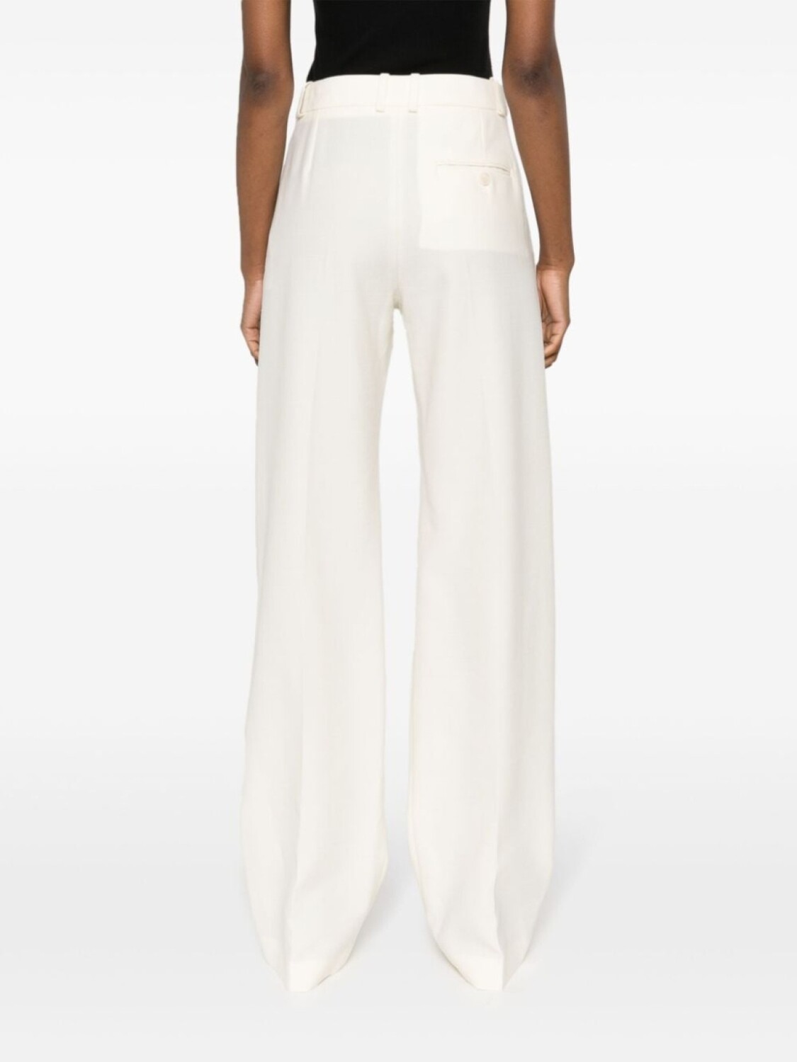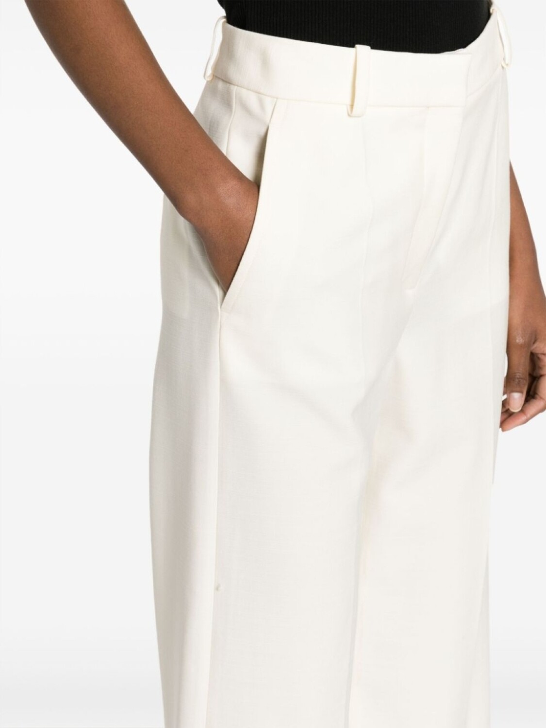 Кремово-белый, шерсть, стрелки, завышенная талия, петли для ремня, прямой крой, потайная застежка спереди, два вшитых кармана по бокам и прорезной карман на пуговице сзади. Узнать больше о том, какие товары получают отметку «Ответственный выбор», можно из материала «Как мы оцениваем экологичность и этичность».