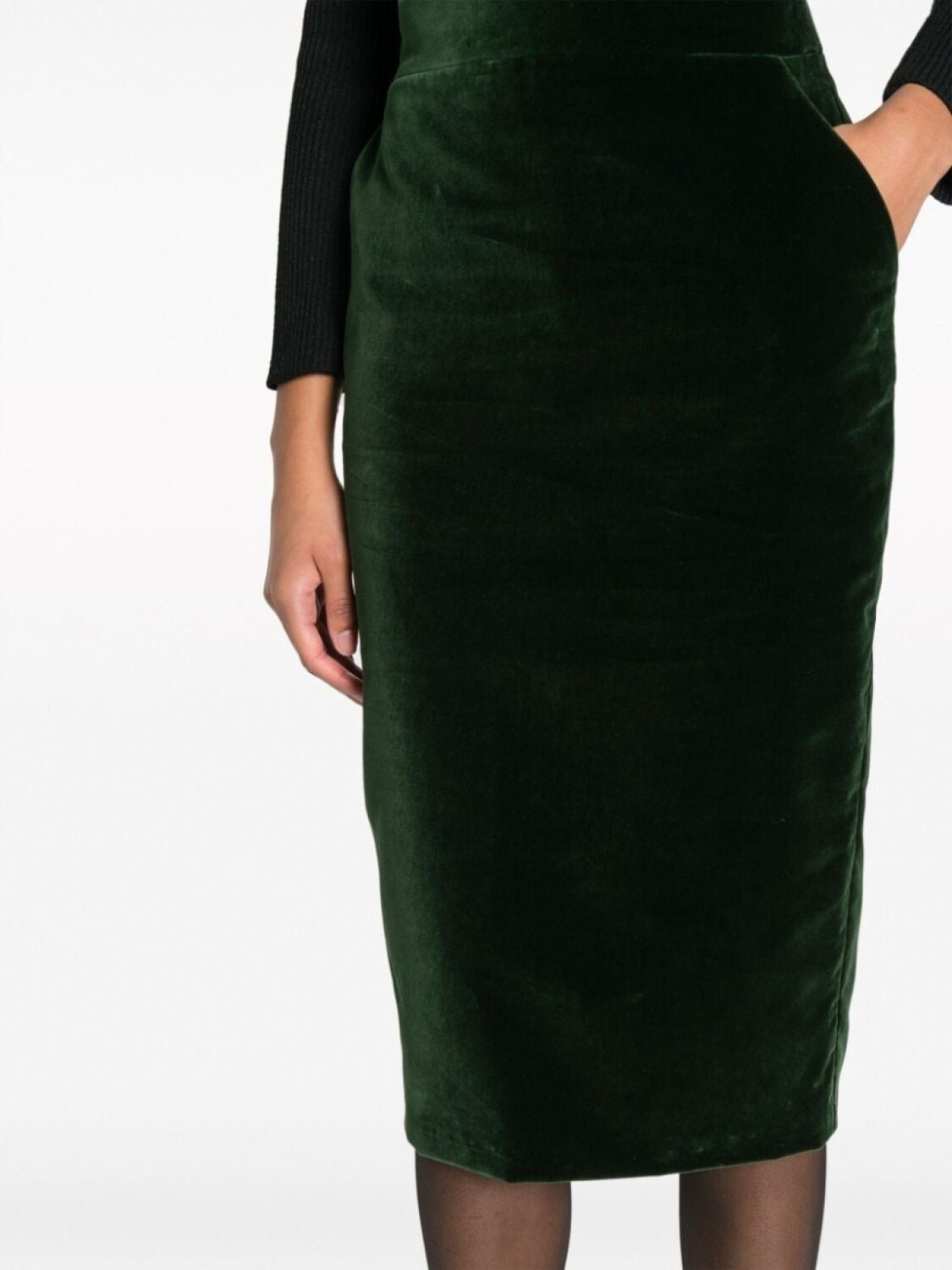 Насыщенный зеленый, хлопок, бархат, завышенная талия, застежка на молнии сзади, два кармана по бокам, прямой подол и длина ниже колена.
