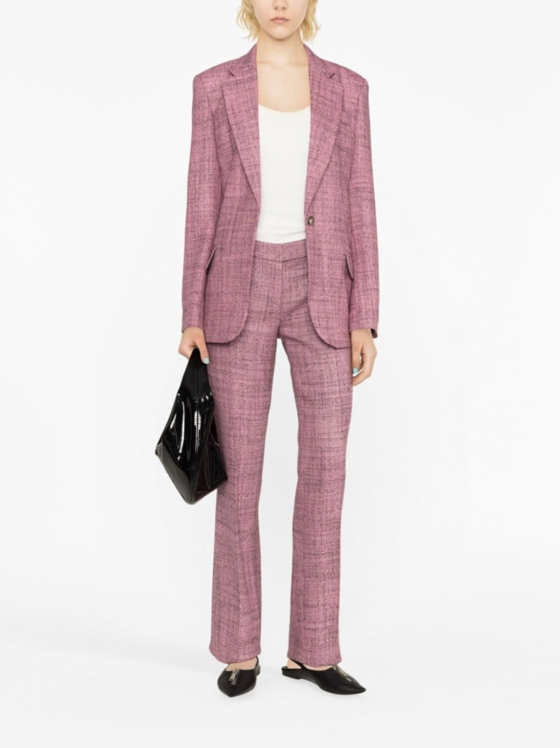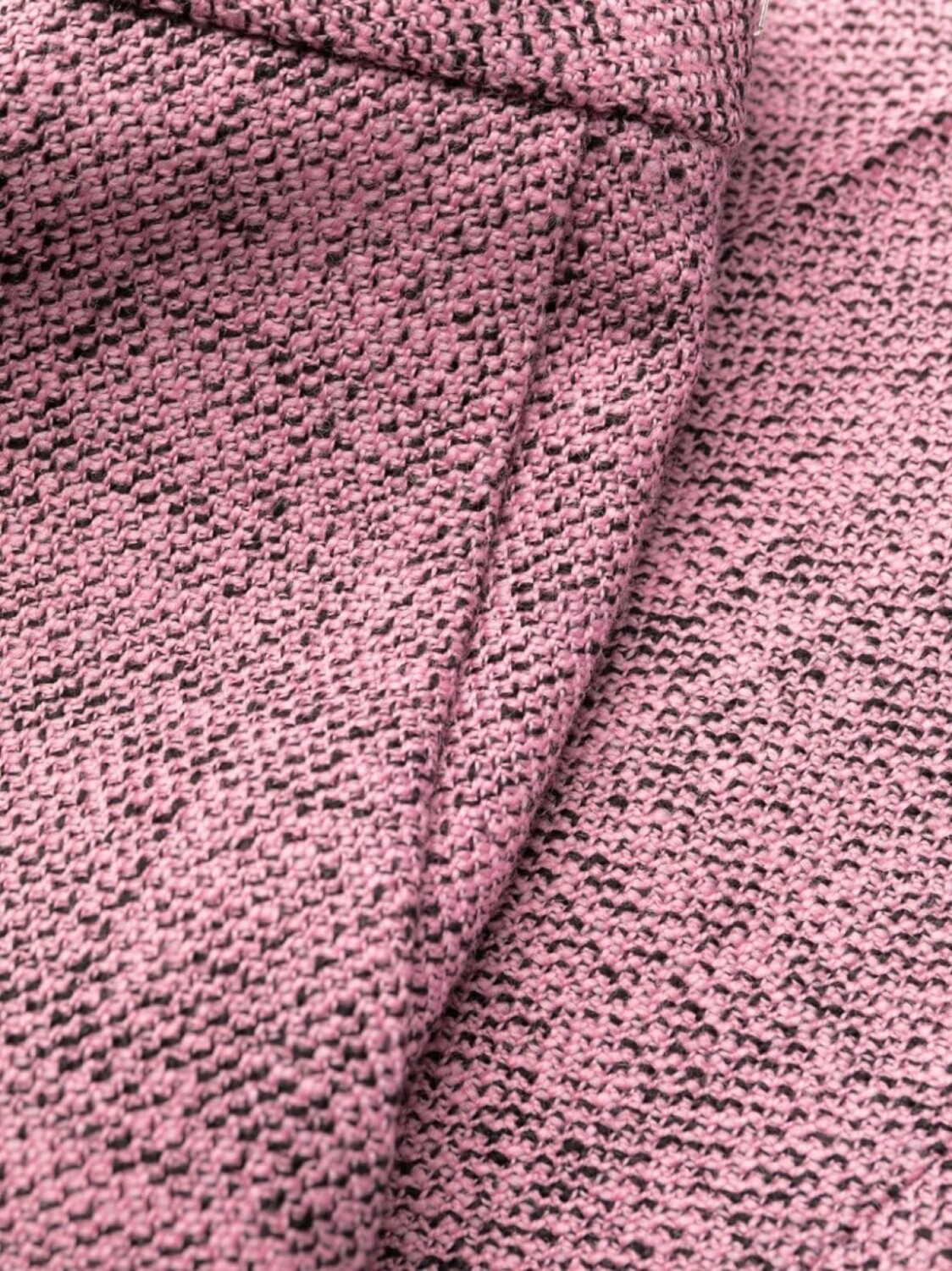 Пудрово-розовый, шерсть, эффект меланж, классический крой, стрелки, потайная застежка спереди, два прорезных кармана по бокам и расклешенный подол. Узнать больше о том, какие товары получают отметку «Ответственный выбор», можно из материала «Как мы оцениваем экологичность и этичность».