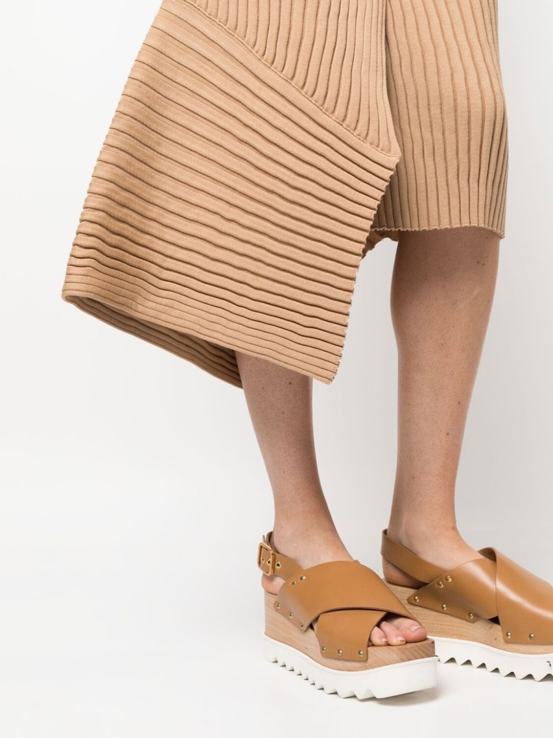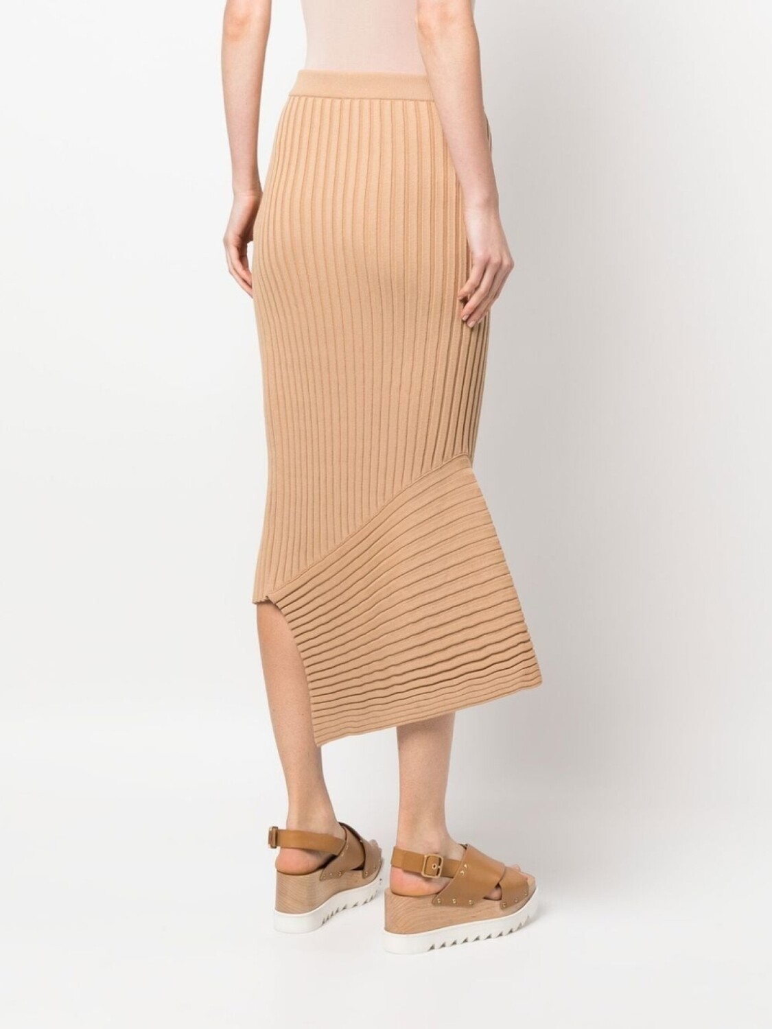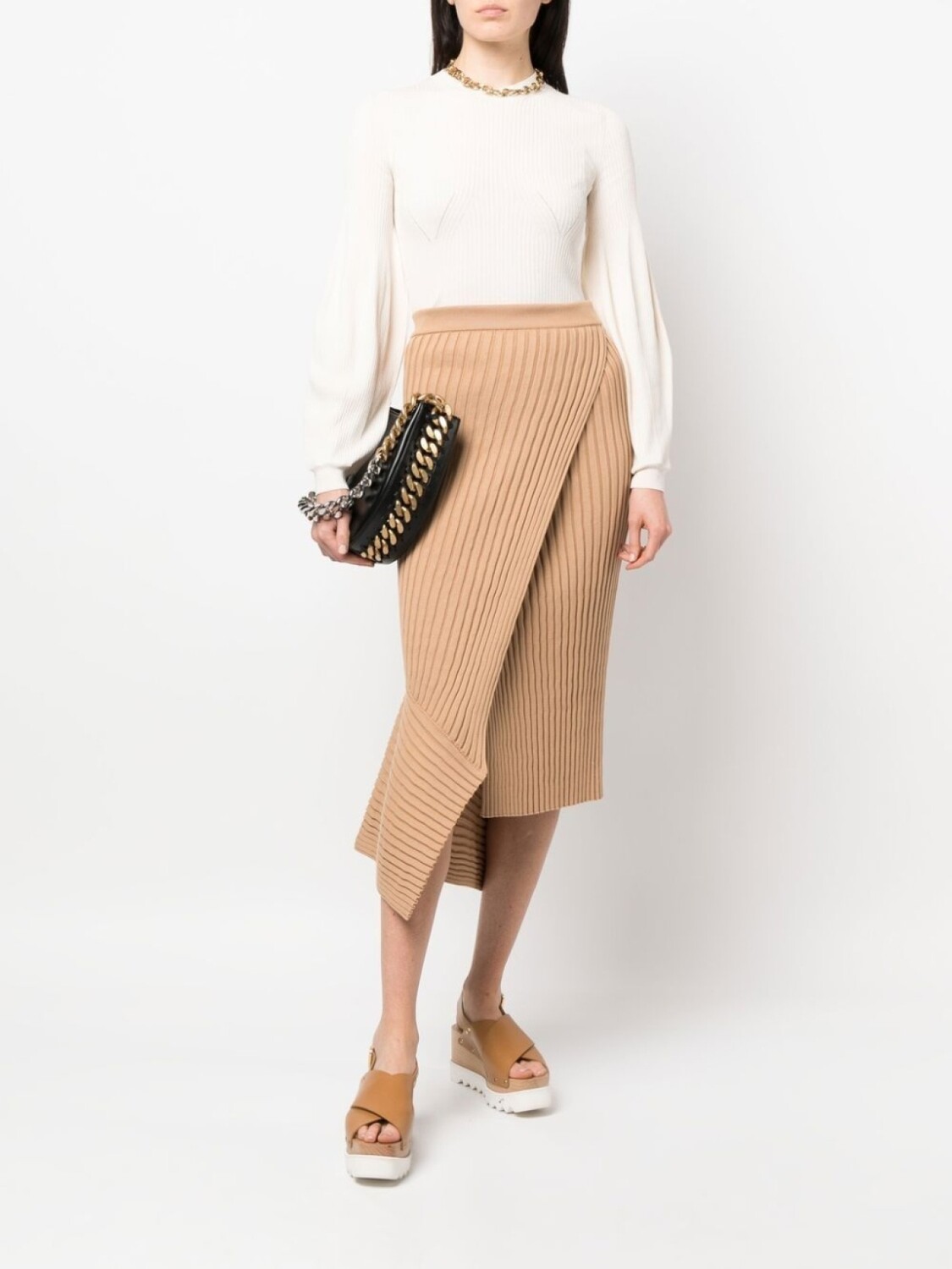 Бежево-коричневый, хлопок, трикотаж в крупный рубчик, юбка с запахом, эластичный пояс, асимметричная форма, вставки и длина миди. .