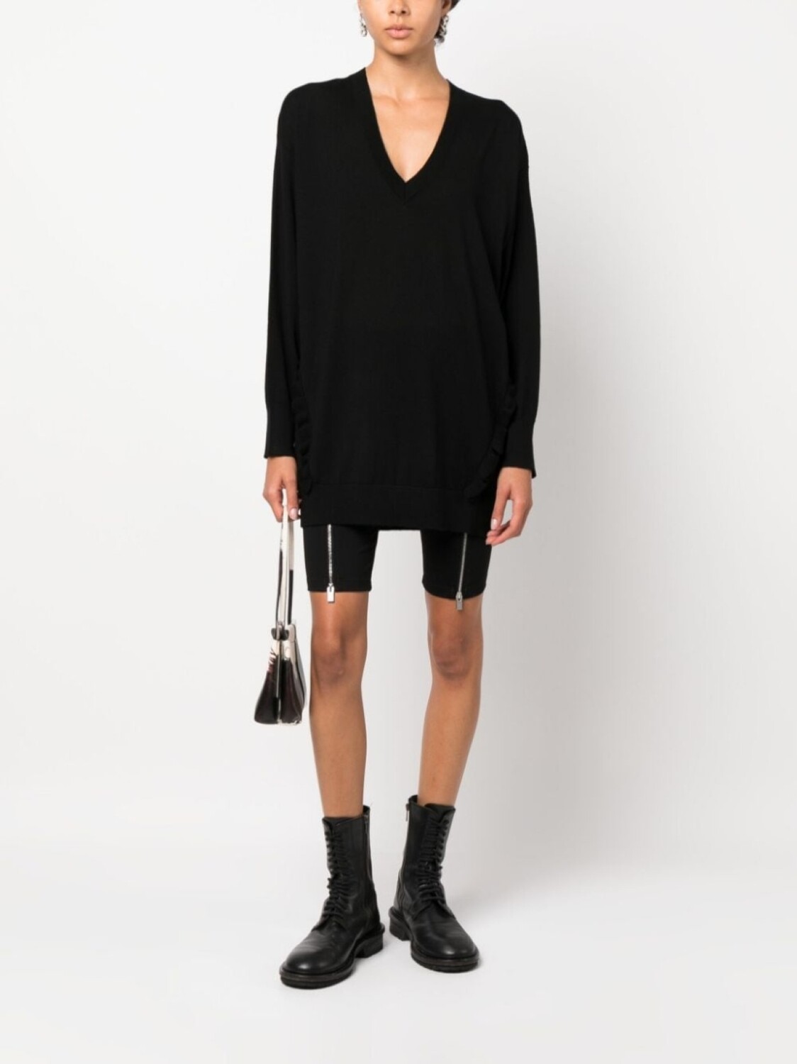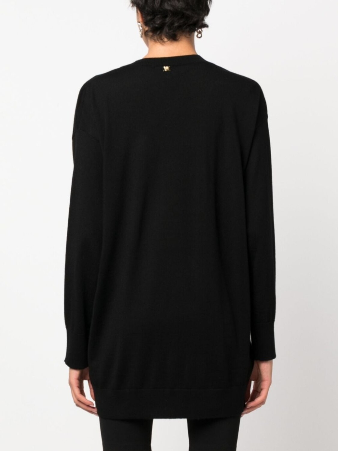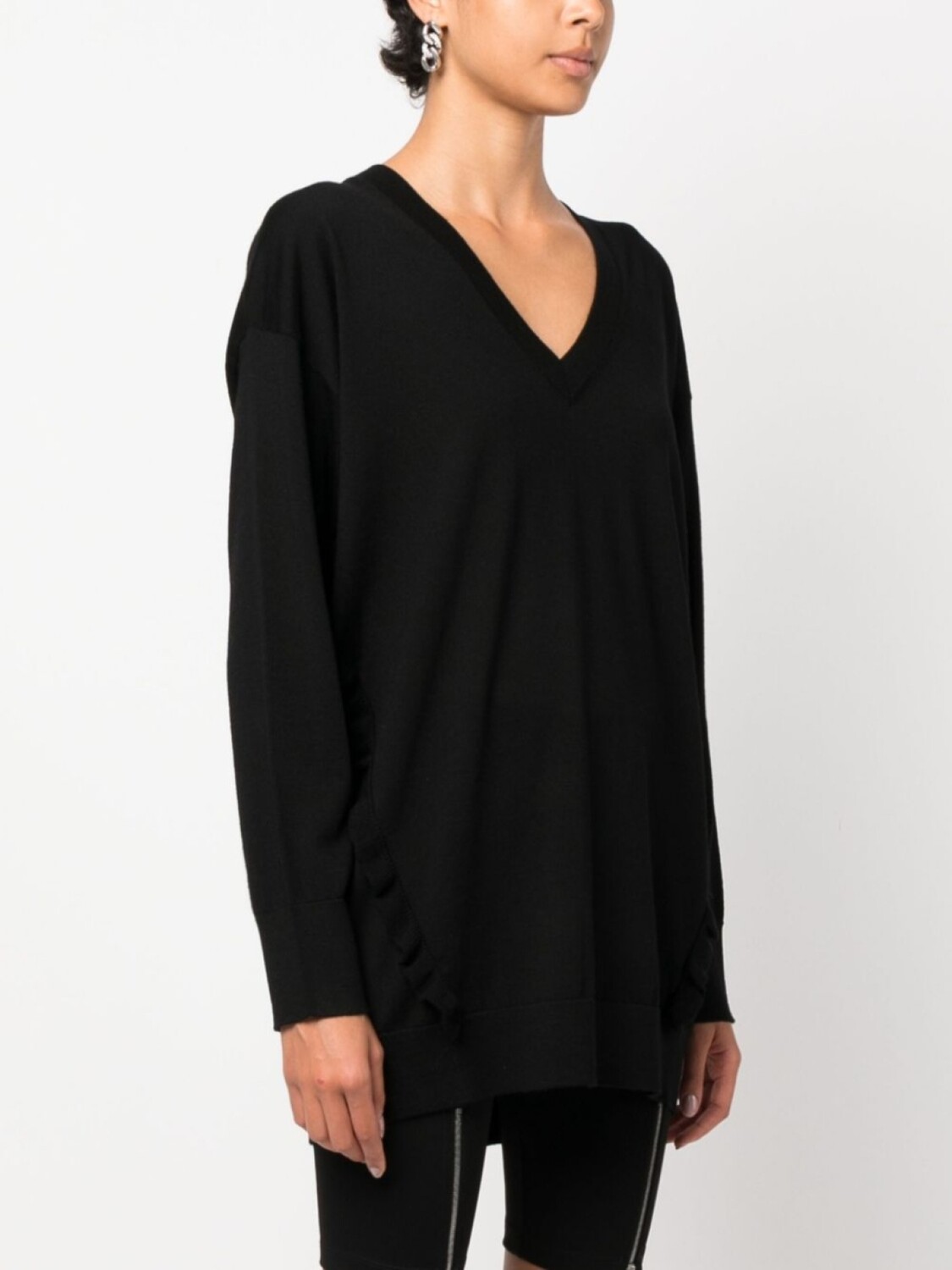 Черный, шерсть, трикотажный материал, вставки с оборками, золотистый металлический логотип, V-образный вырез и длинные рукава.