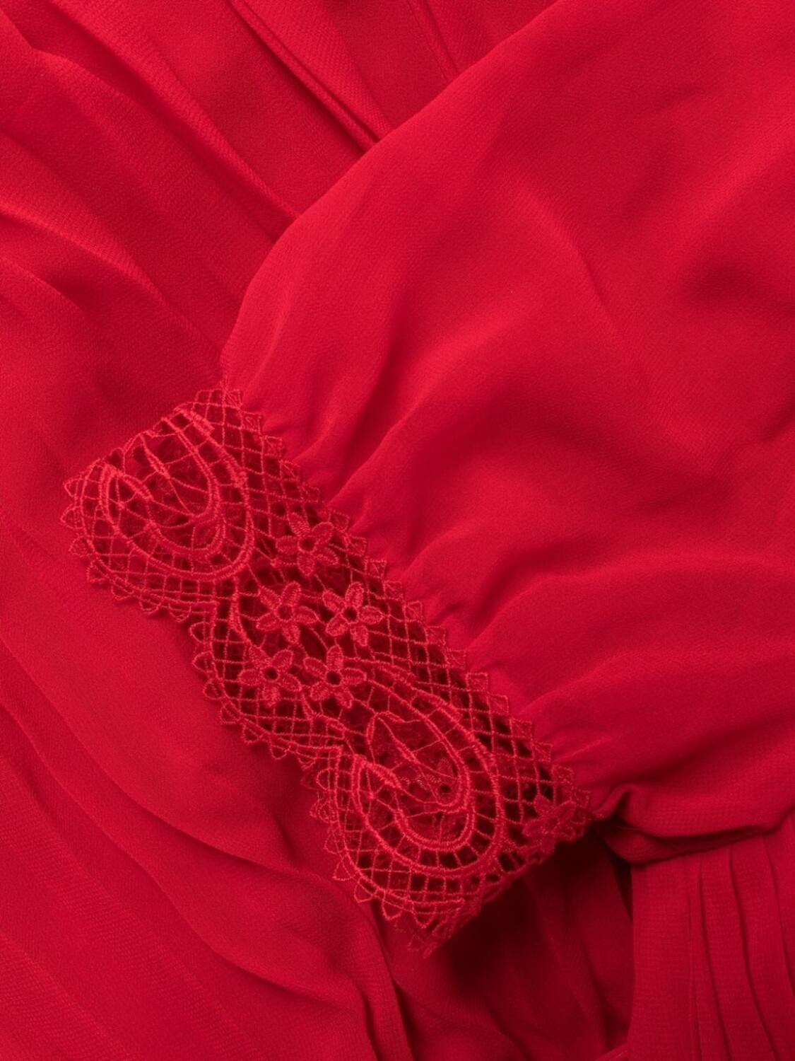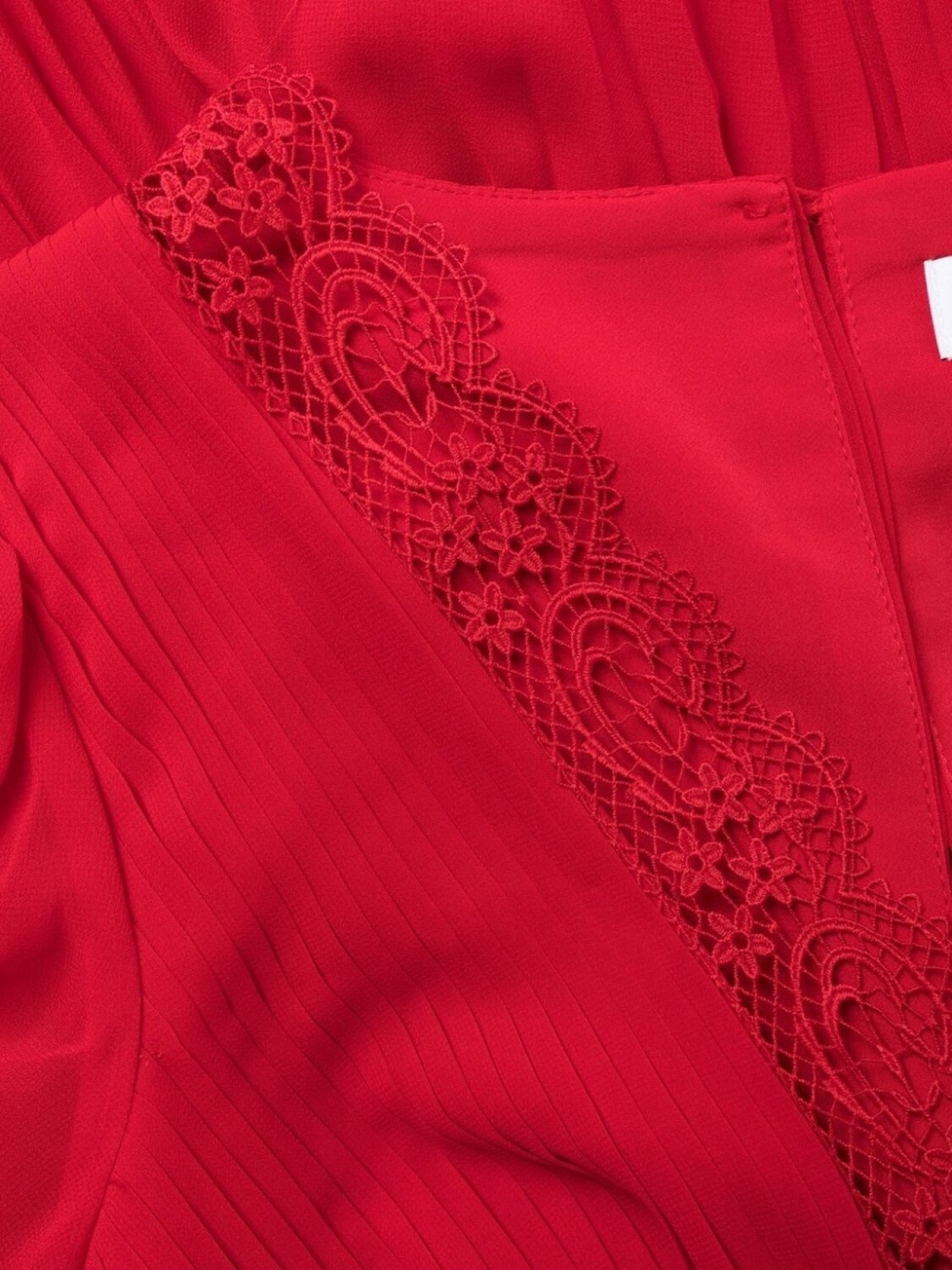 Ярко-красный, плиссированная модель, кружевная отделка, ремень на талии, V-образный вырез, короткие рукава, длина выше колена и закругленный подол.