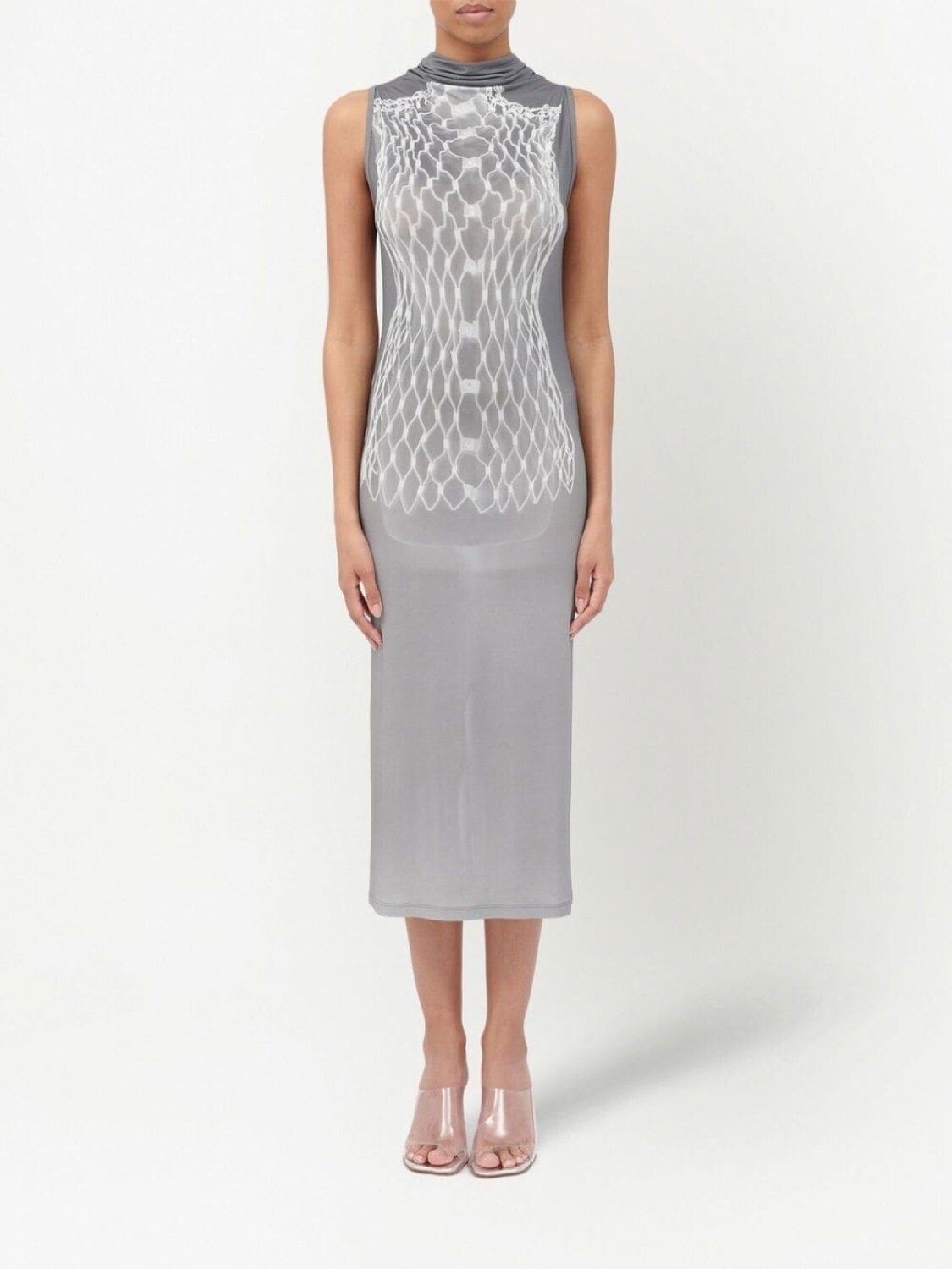 Серый, эластичный материал, эффект омбре, драпировка, графичный принт спереди, воротник со сборками, без рукавов, вырез сзади и длина до середины икры.