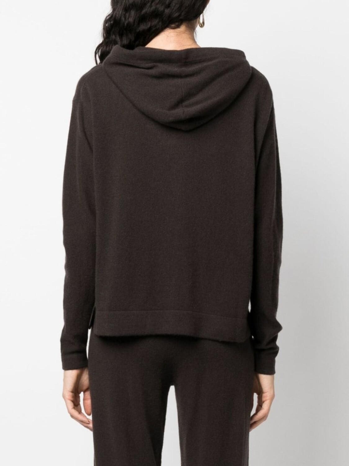 Кофейный, смесь шерсти и кашемира, трикотажный материал, затягивающийся на шнурок капюшон, застежка на молнии спереди, длинные рукава и прямой подол.