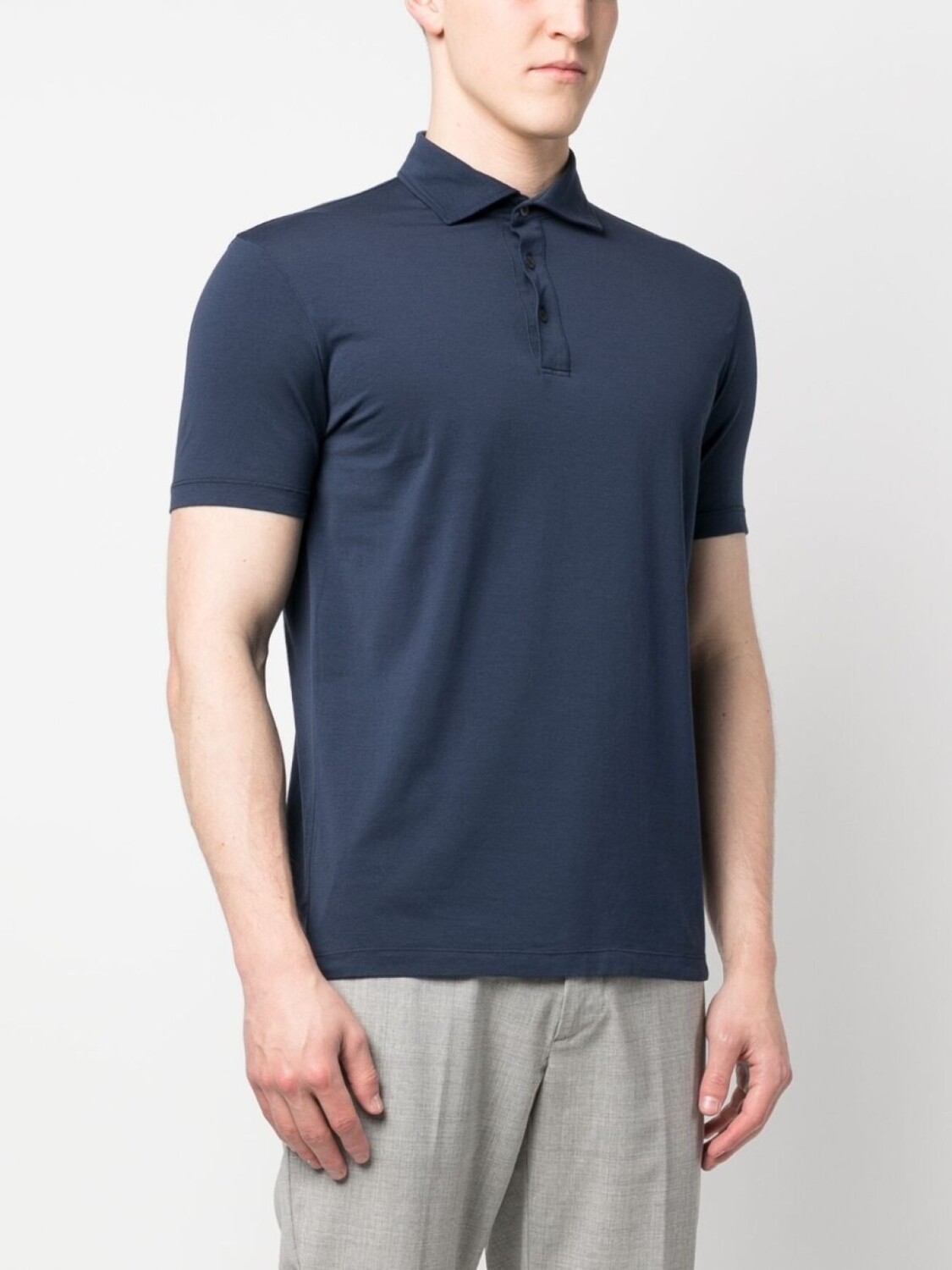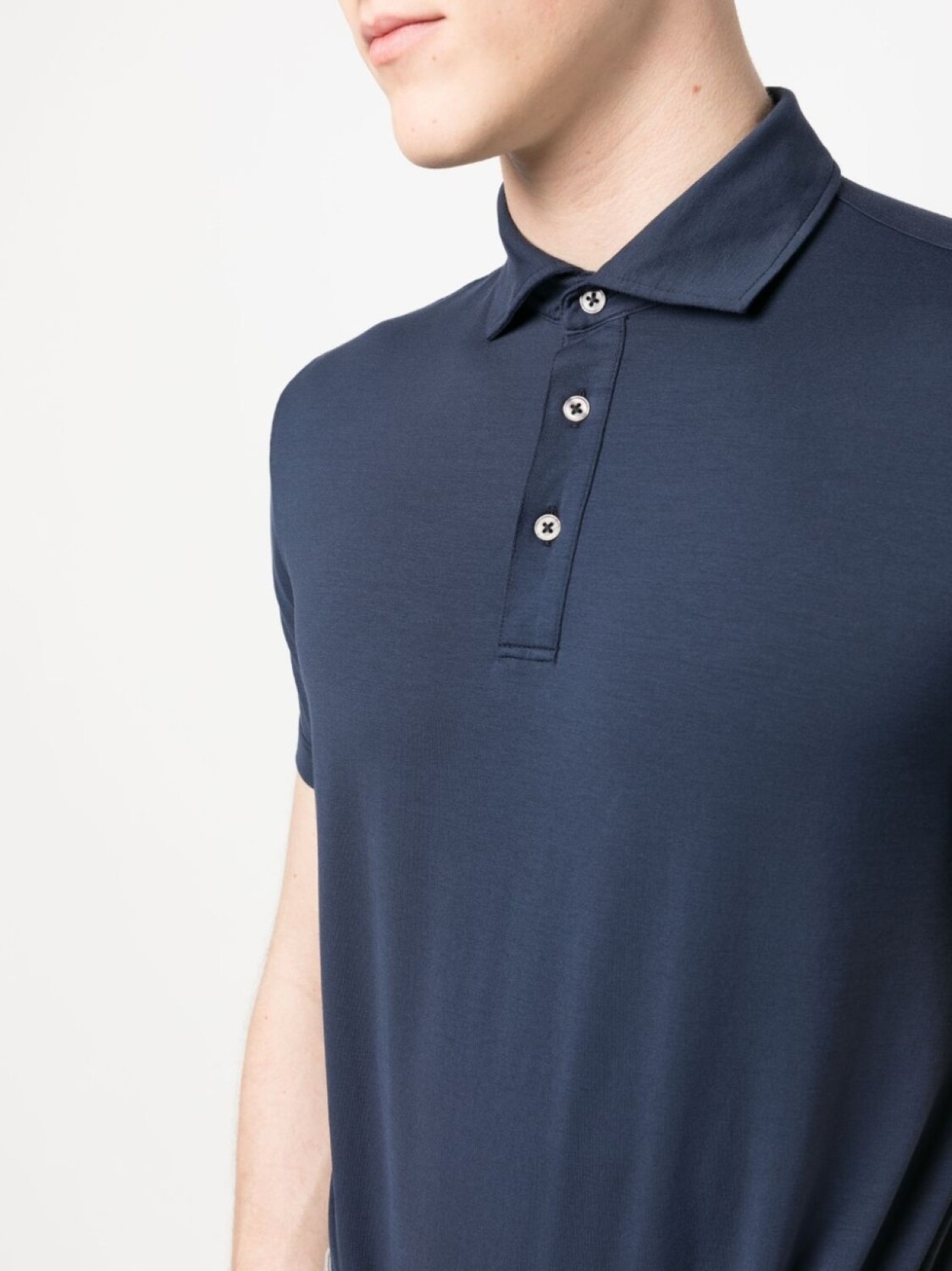 Темно-синий, эластичный хлопок, воротник поло, планка на пуговицах спереди, короткие рукава и прямой подол.