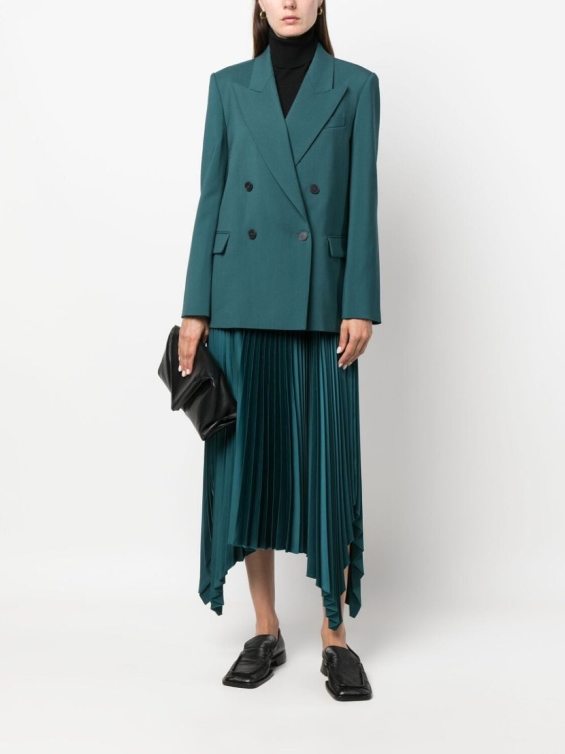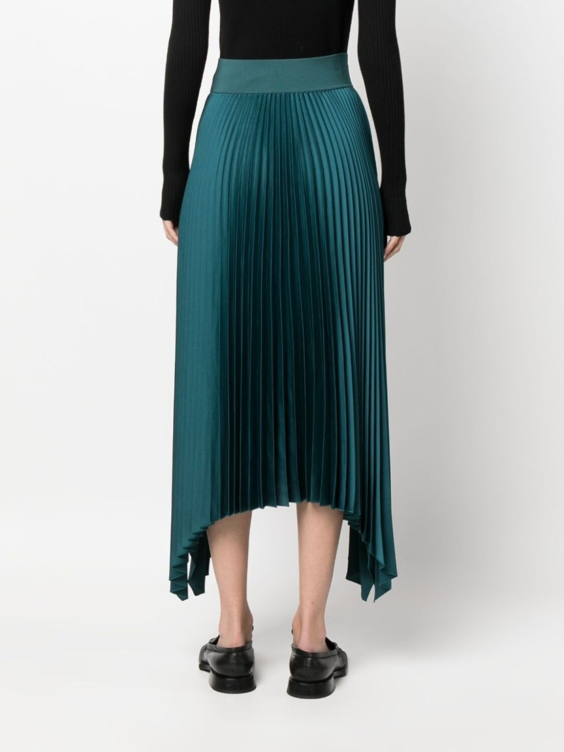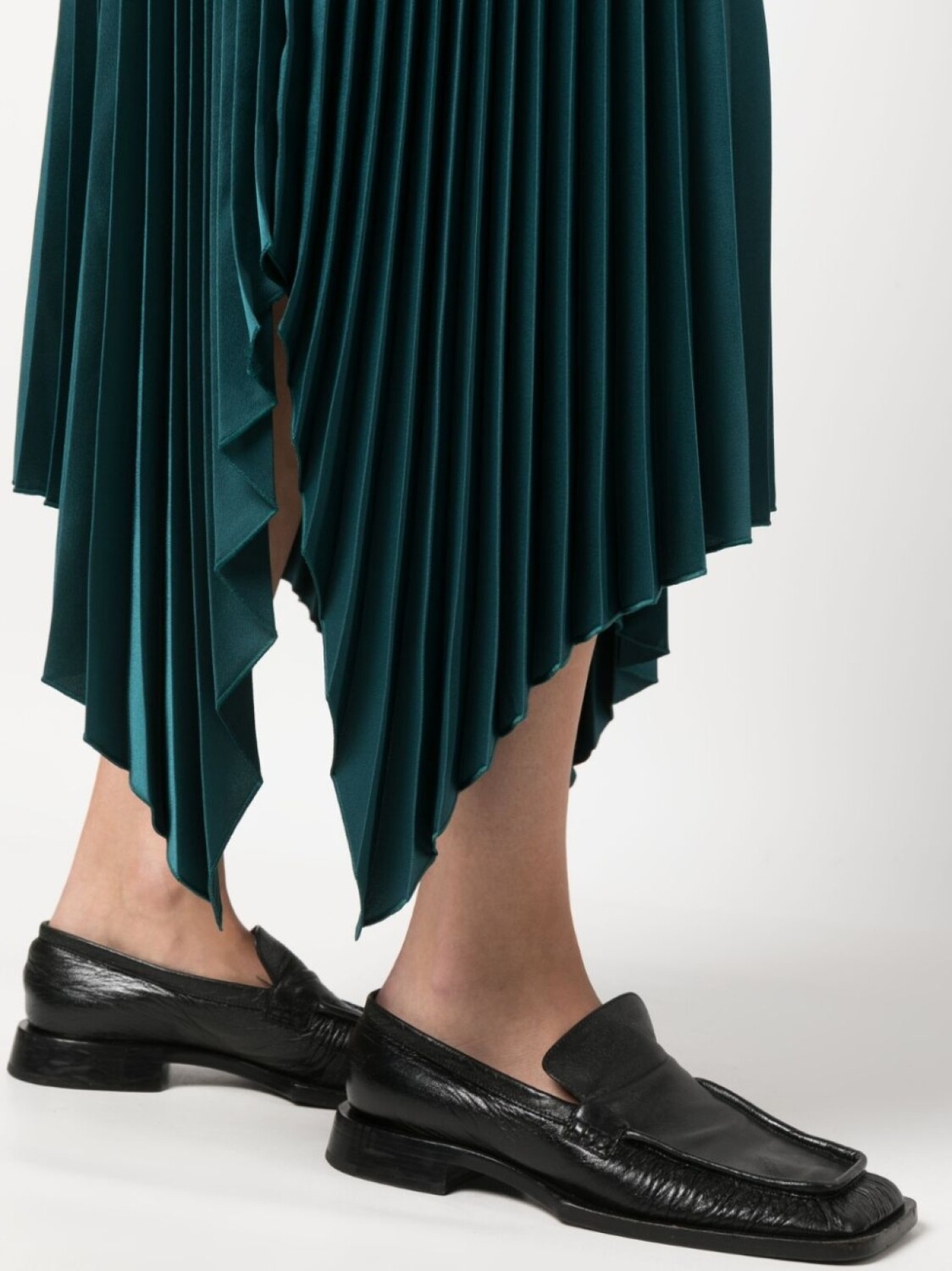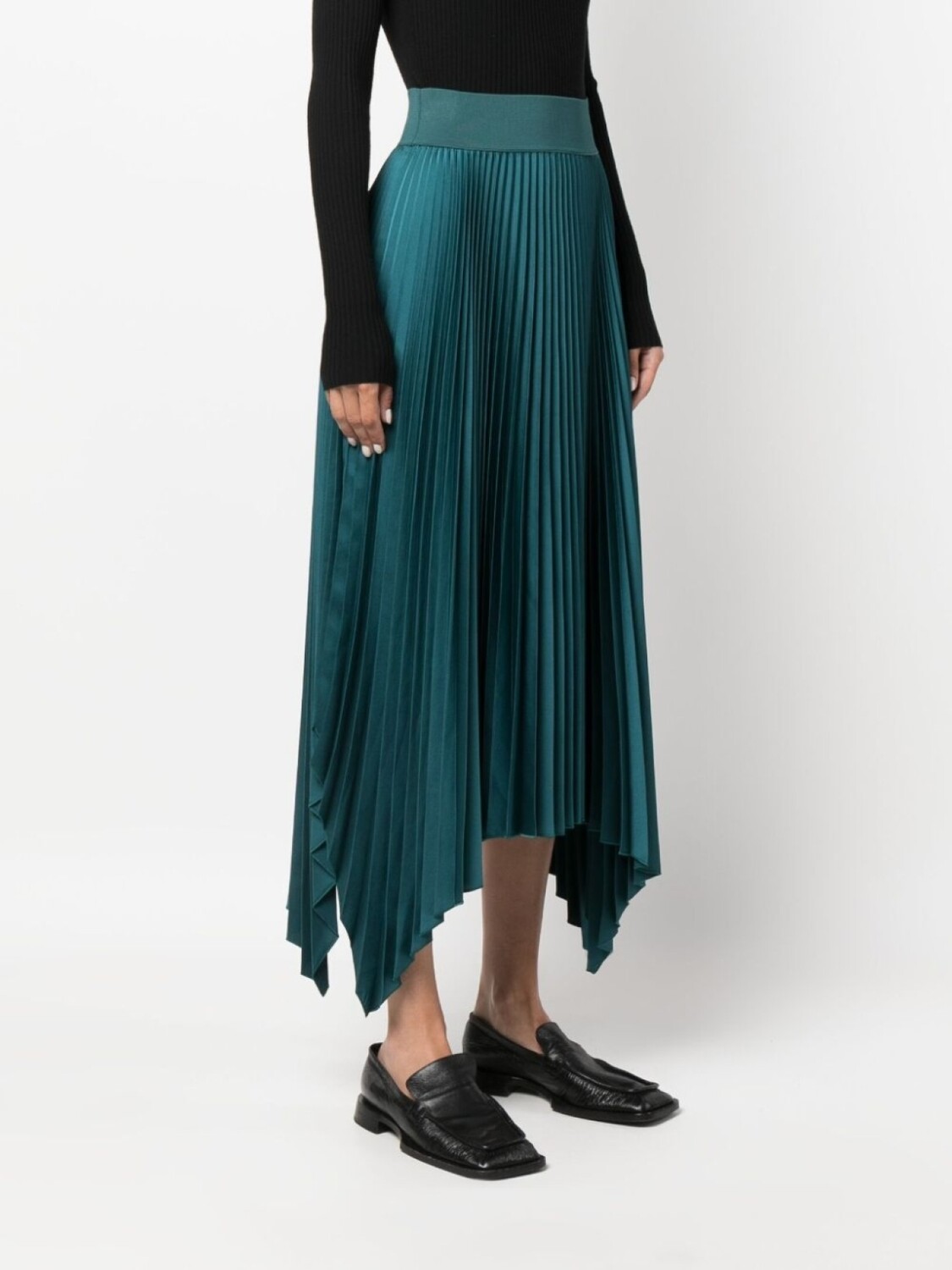 Изумрудно-зеленый, смягчающее покрытие, А-образный силуэт, завышенная талия, плиссированная модель, длина миди, эластичный пояс, асимметричный подол и флюид.