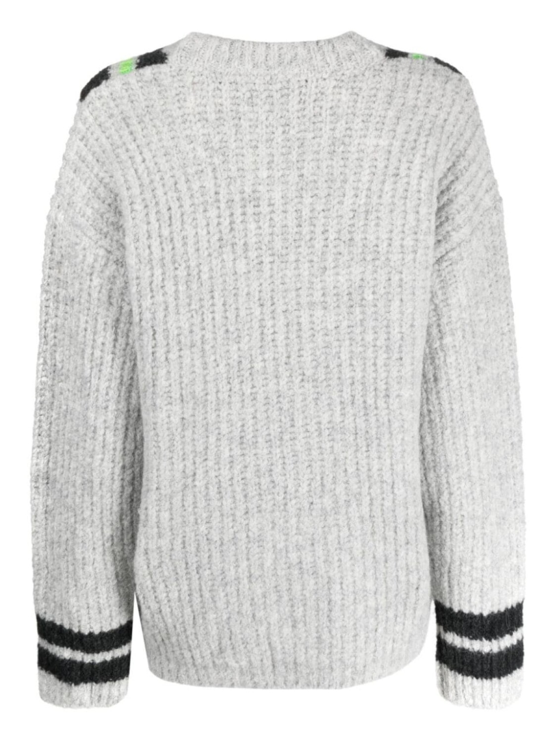 Светло-серый, разноцветный, крупная вязка, края в рубчик, края в полоску, вышивка, V-образный вырез, длинные рукава и прямой подол.