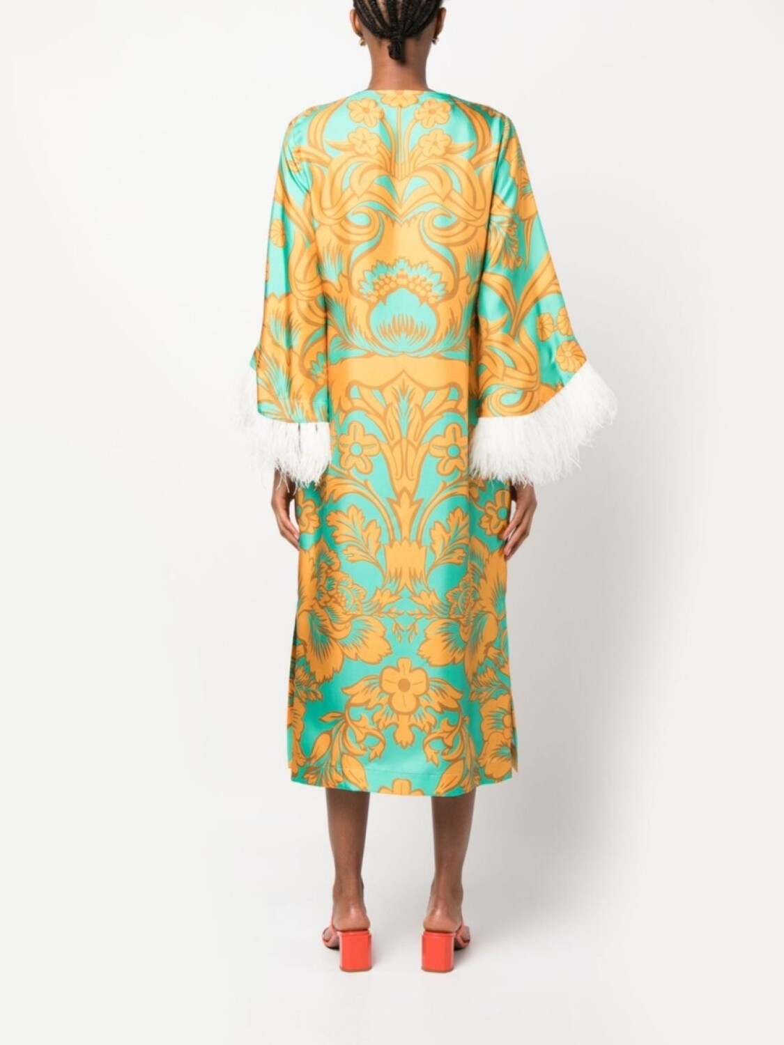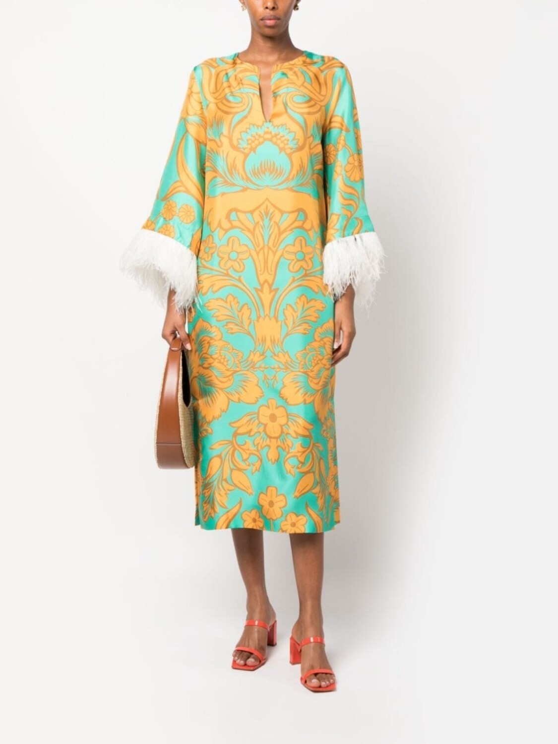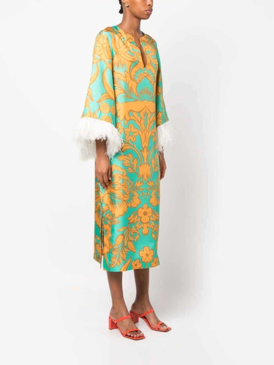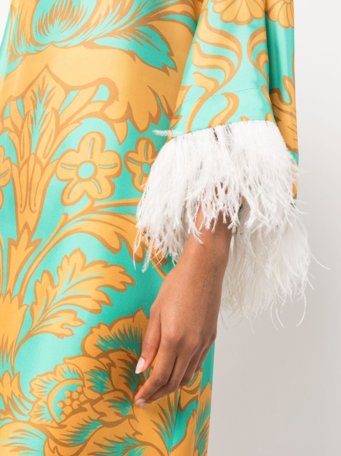 Бирюзовый, золотистый, шелк, сплошной цветочный принт, отделка перьями, воротник с разрезом, рукава три четверти и длина до середины голени.