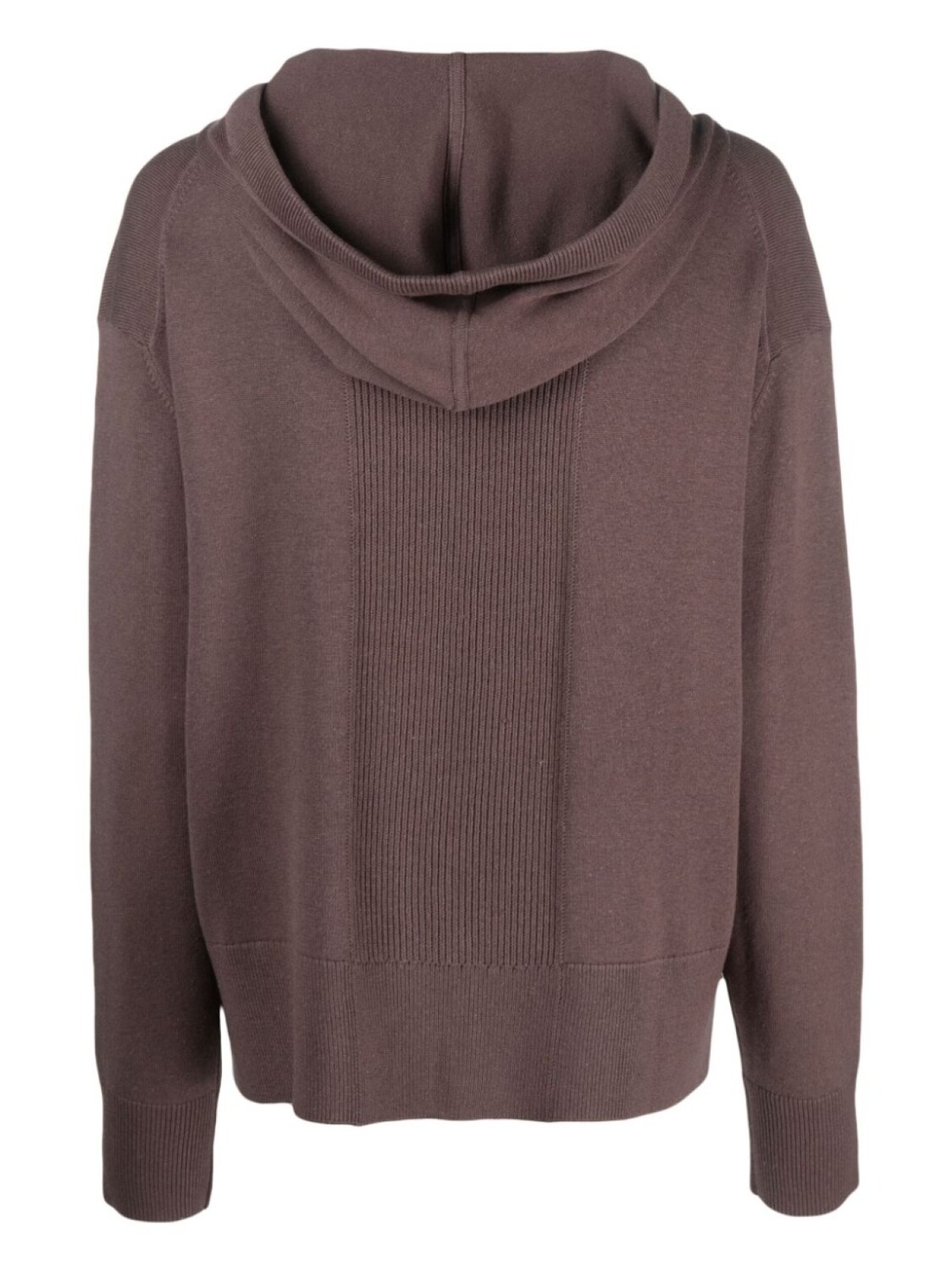 Шоколадный, смесь шелка и хлопка, трикотажный материал, затягивающийся на шнурок капюшон, приспущенные плечи и длинные рукава.