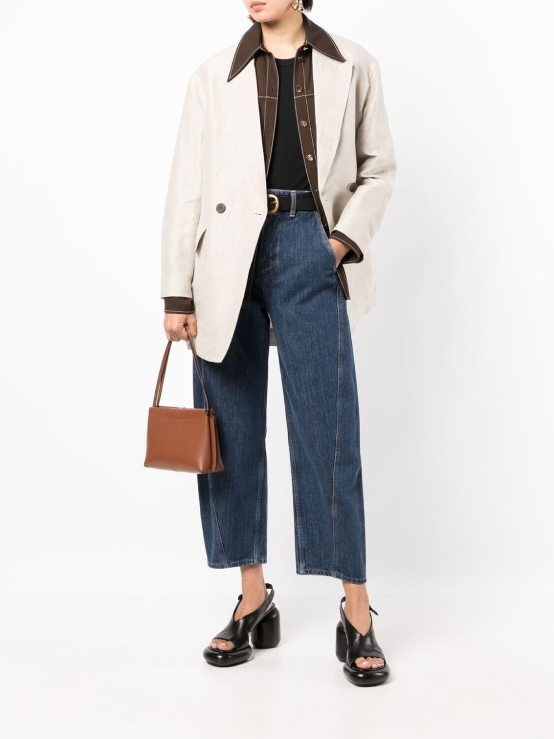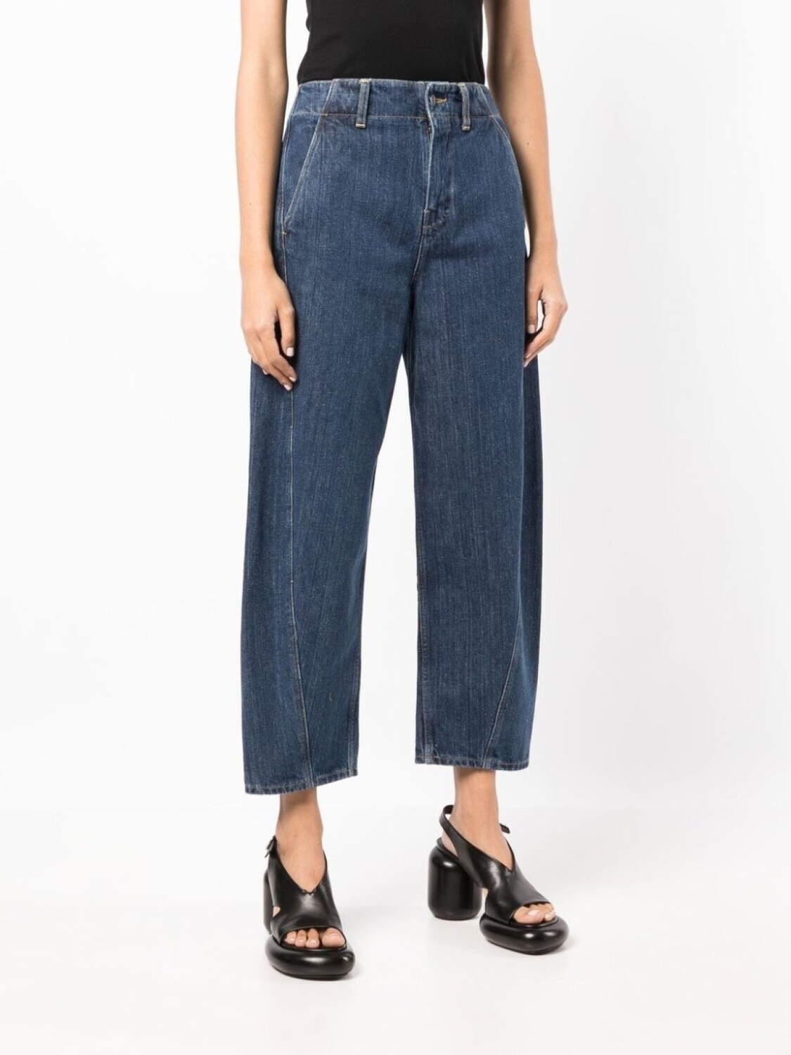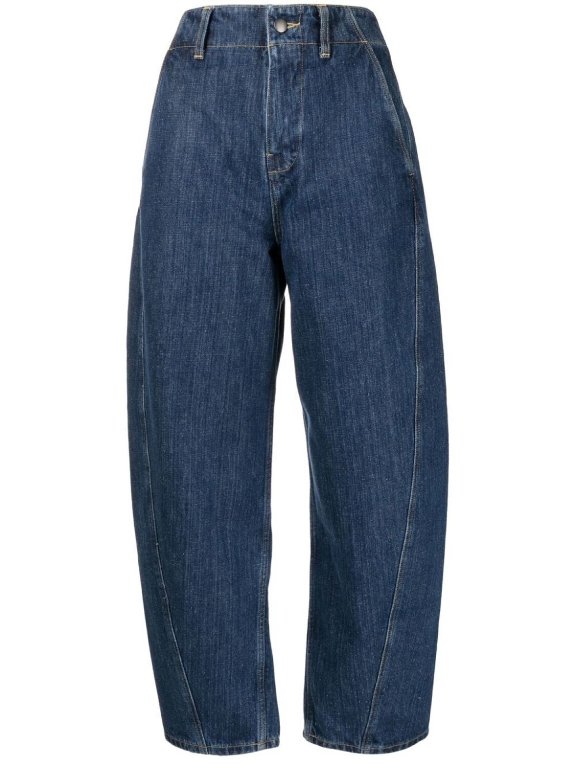 Индиго, смесовый хлопок, завышенная талия, петли для ремня, застежка на молнии и пуговице спереди, два кармана по бокам, два кармана с листочкой сзади, закругленная форма и укороченная длина.