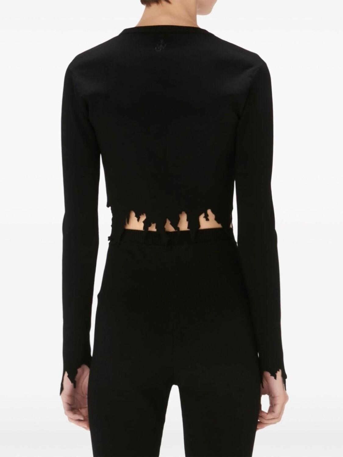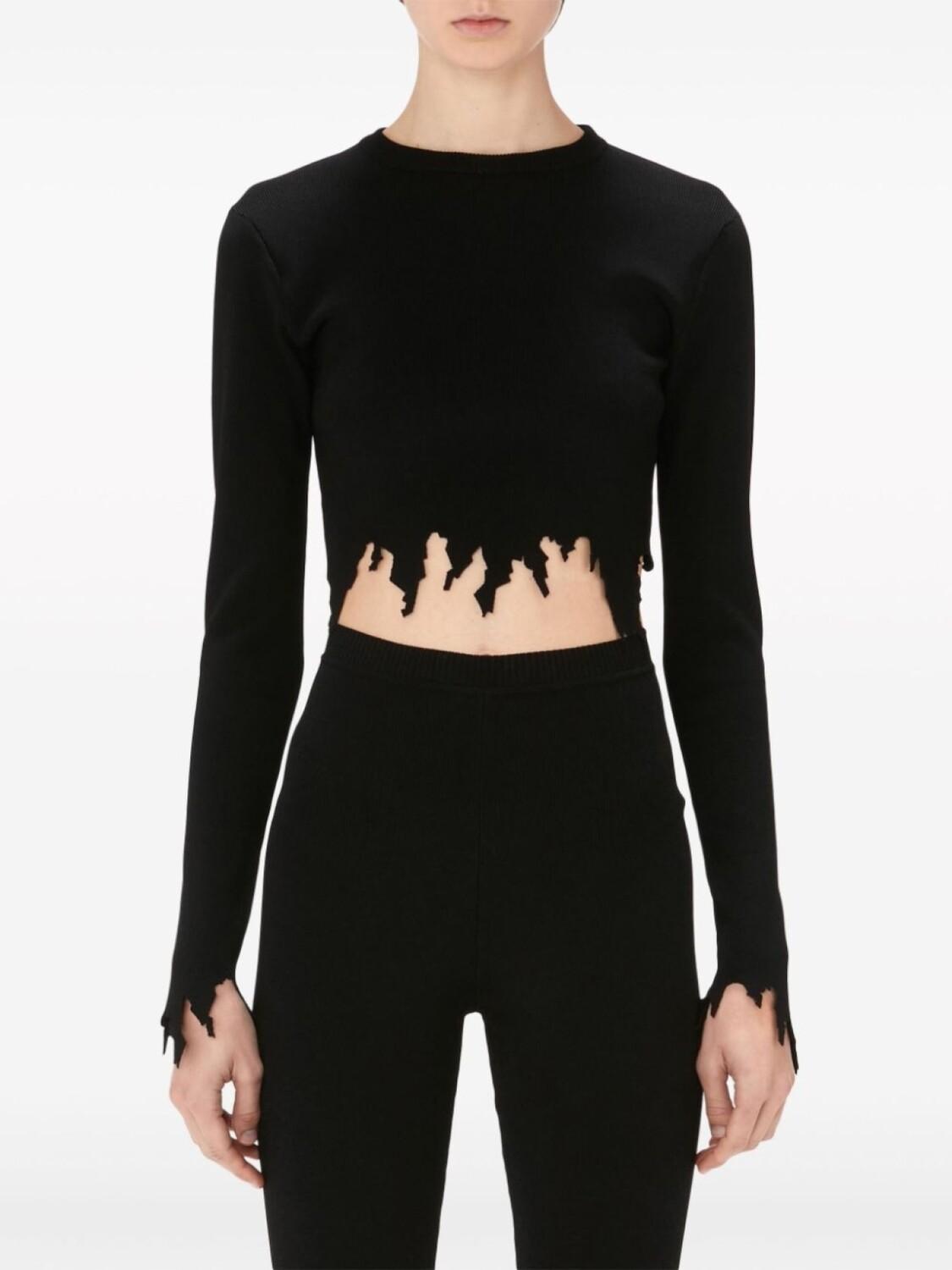 Черный, ткань в мелкий рубчик, перфорация, круглый вырез, длинные рукава, асимметричный подол и укороченная длина.