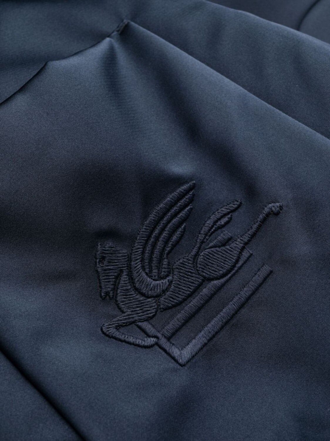 Темно-синий, узор Pegaso, завышенная линия талии, зауженный крой, широкий крой, длина макси, два кармана по бокам, два накладных кармана сзади, потайная застежка на молнии и пуговицах и петли для ремня.