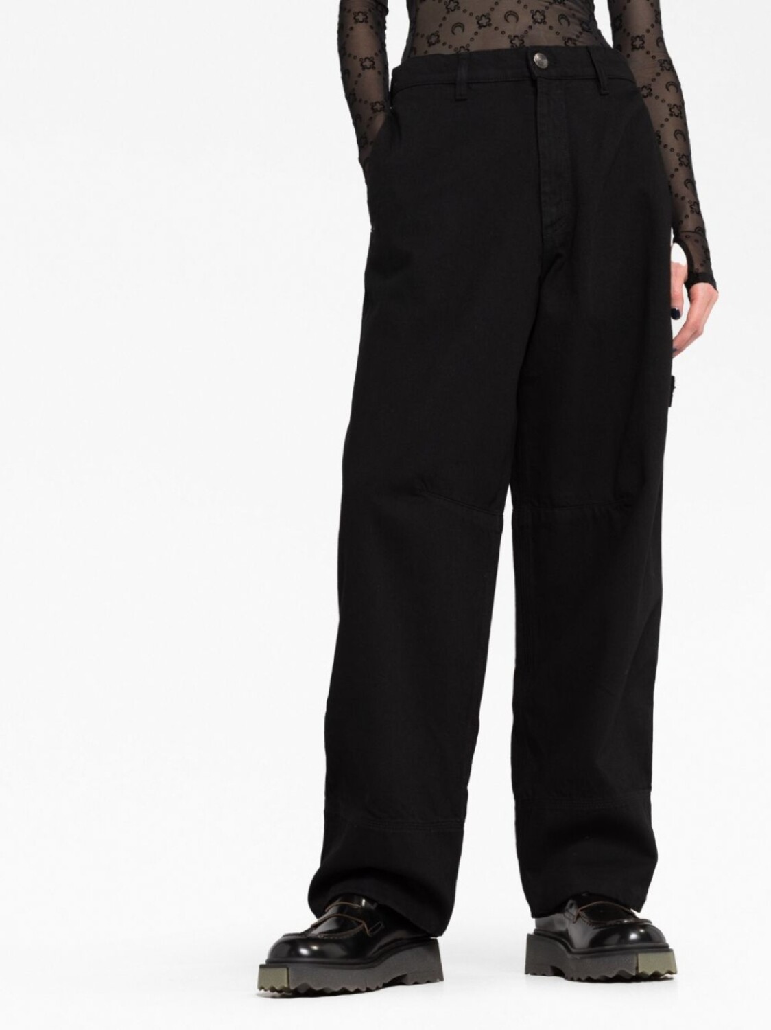 Черный, хлопок, петли для ремня, застежка на пуговицах спереди, пять карманов и широкий крой.