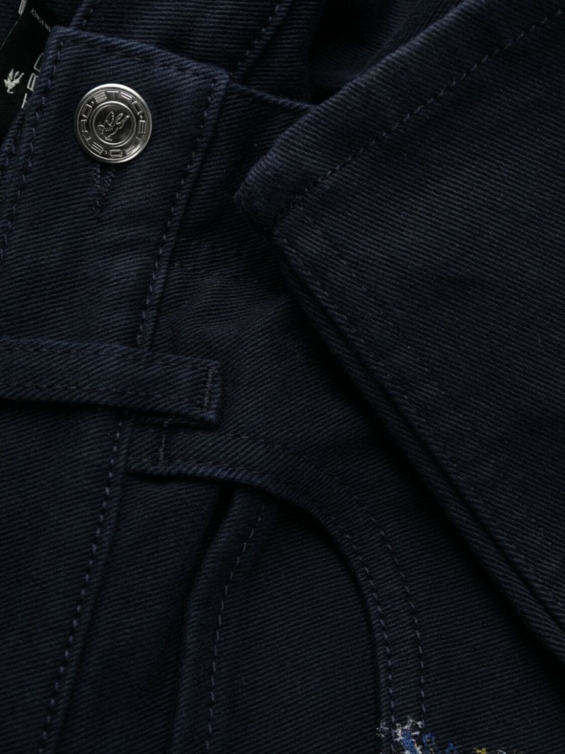 Индиго, эластичный хлопок, деним, темный оттенок денима, цветочный принт, полоска сбоку, нашивка с логотипом сзади, прямой крой, средняя посадка, потайная застежка на молнии и пуговицах, петли для ремня и пять карманов.