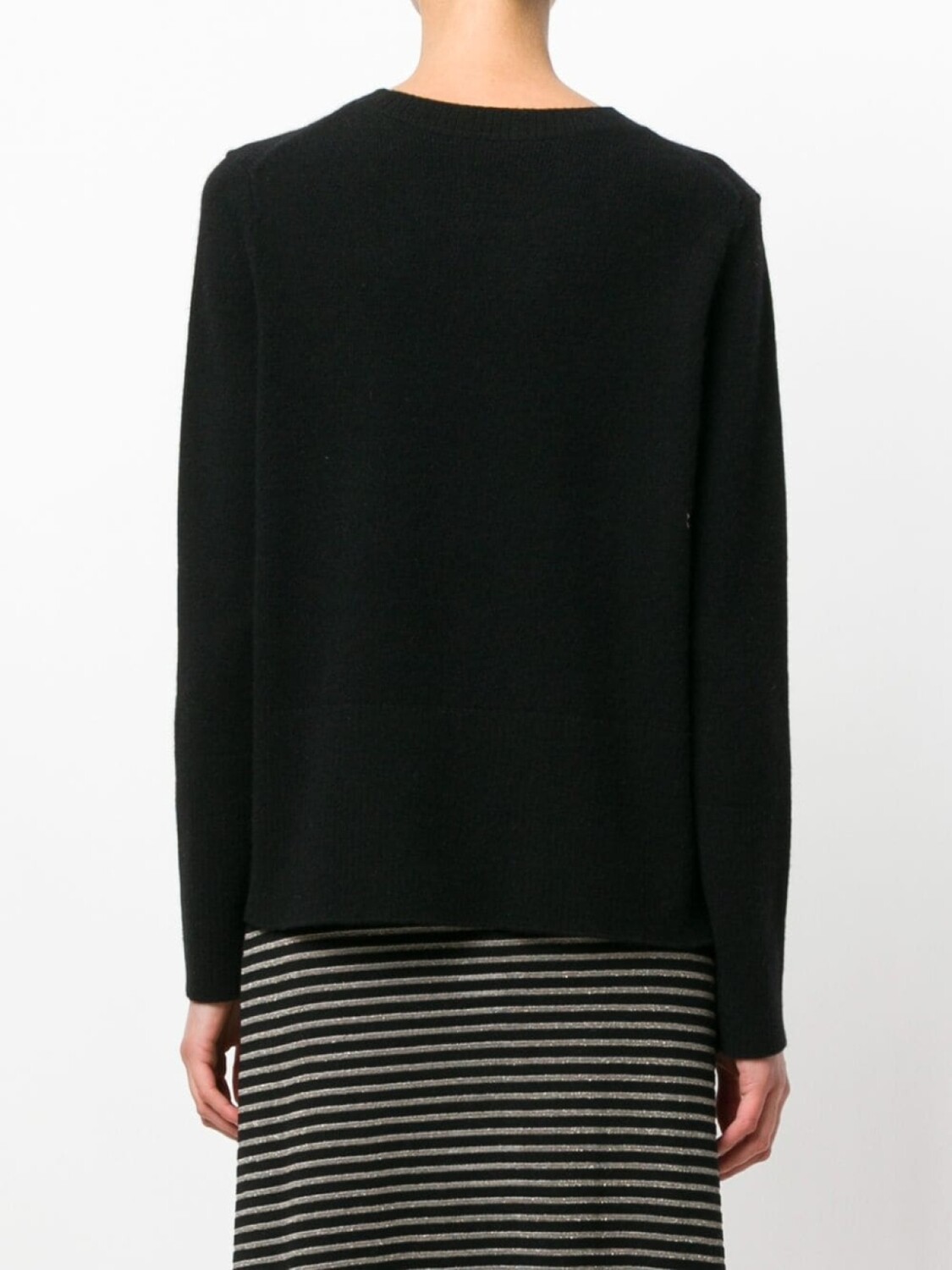 Черный кашемировый свитер тонкой вязки от Chinti & Parker. Круглый вырез под горло в рубчик, прямой подол, длинные рукава, подол и манжеты в рубчик, вышитый логотип сзади.
