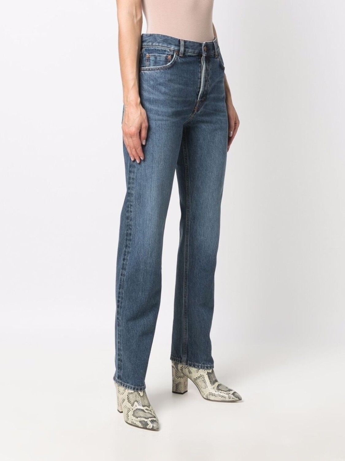 Узкий крой, завышенная талия, классическая пятикарманная модель, потайная застежка на молнии и пуговицах и петли для ремня.