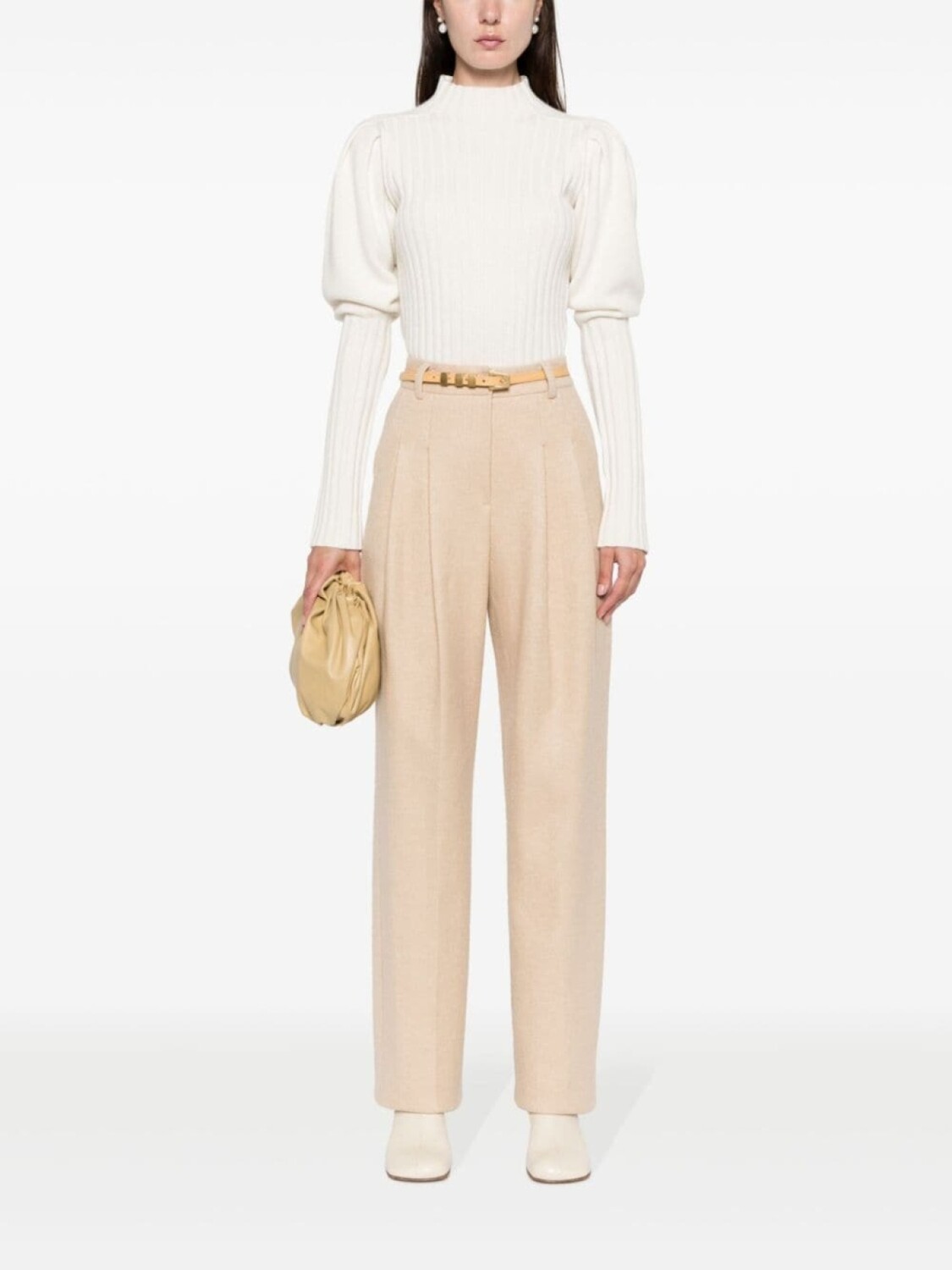 Кремово-белый, кашемир, трикотаж в крупный рубчик, высокий воротник, рукава гиго и прямой подол.