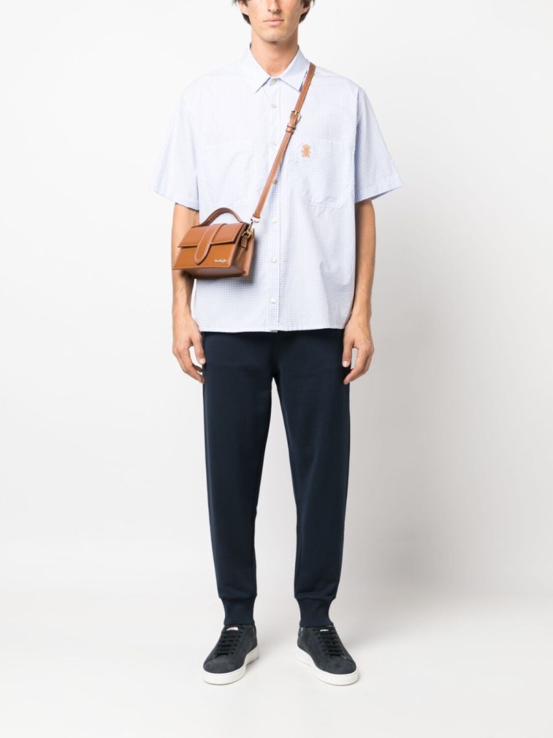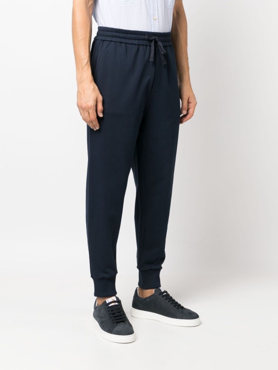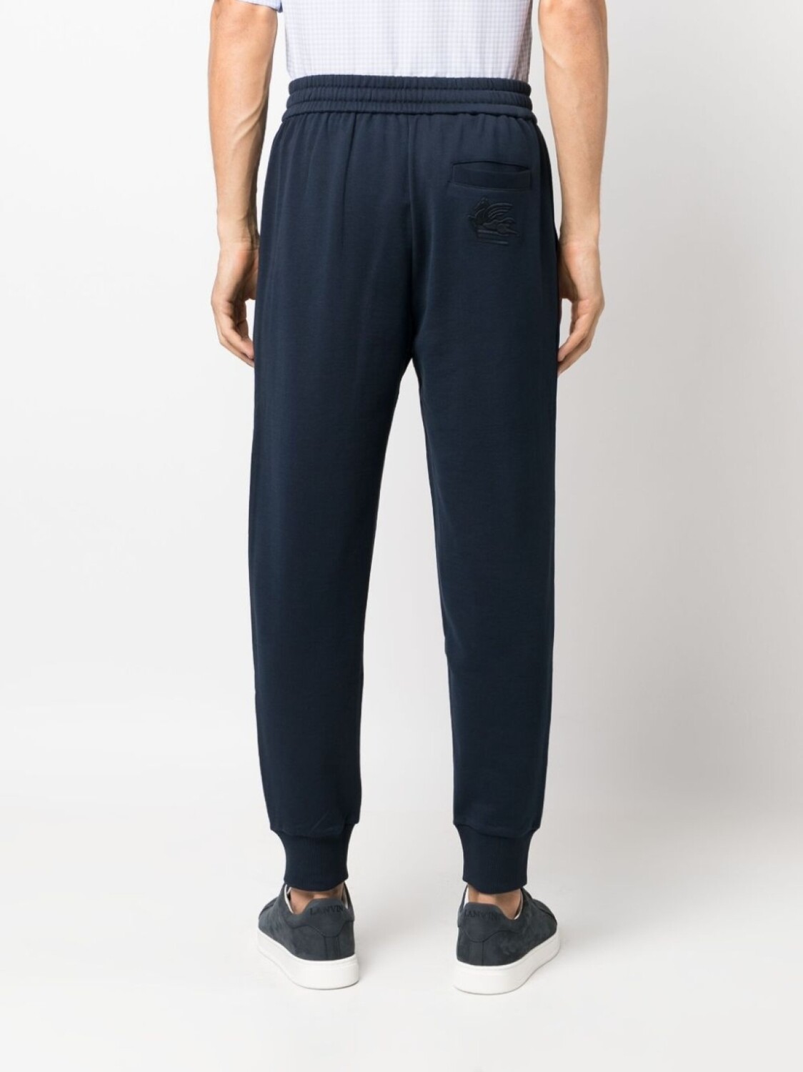 Темно-синий, хлопок, вышитый логотип сзади, узор Pegaso, зауженный крой, кулиска на талии, два вшитых кармана по бокам и два кармана с листочкой сзади.
