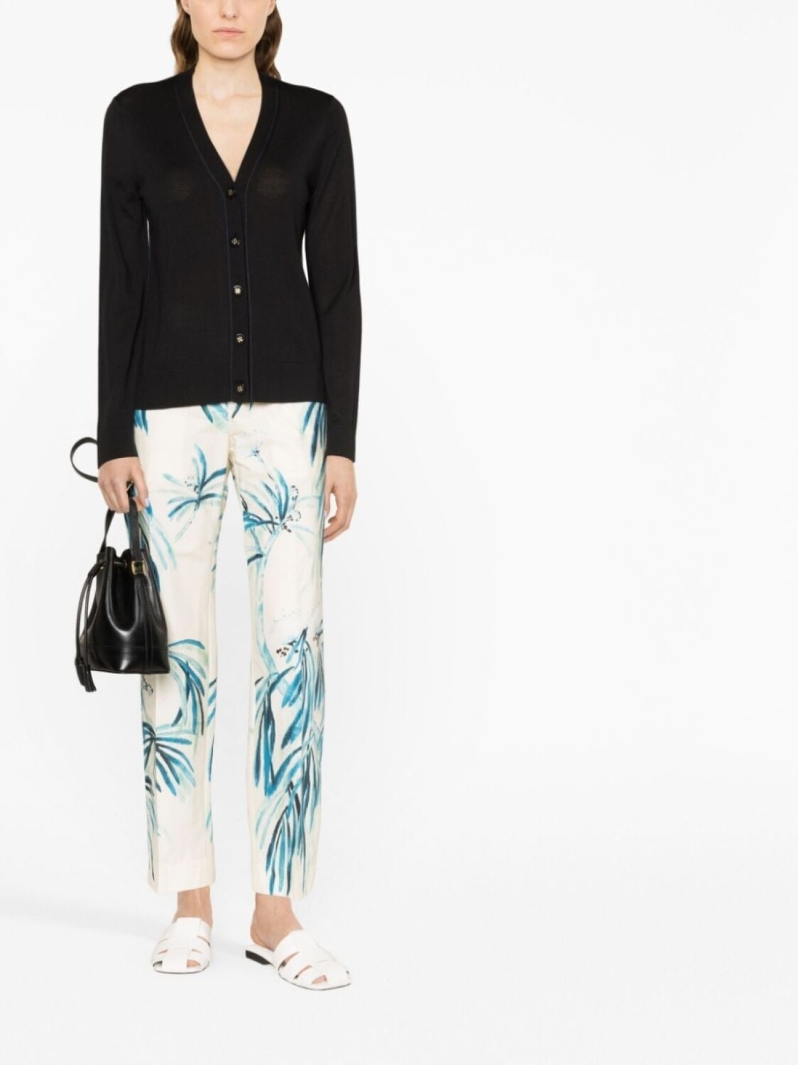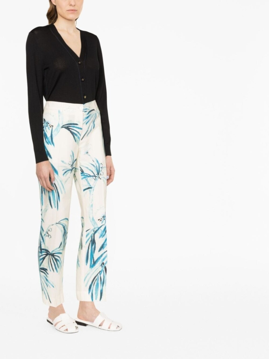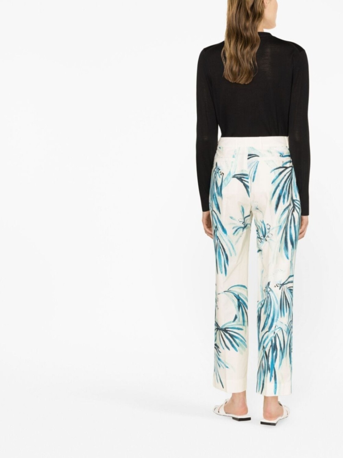 Белый, синий, хлопок, фактурная отделка, принт с изображением листьев, средняя посадка, петли для ремня, застежка на пуговицах спереди, боковые разрезы и прямой крой.