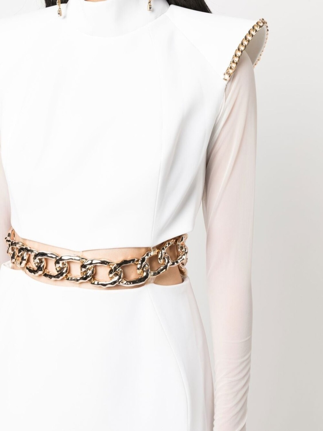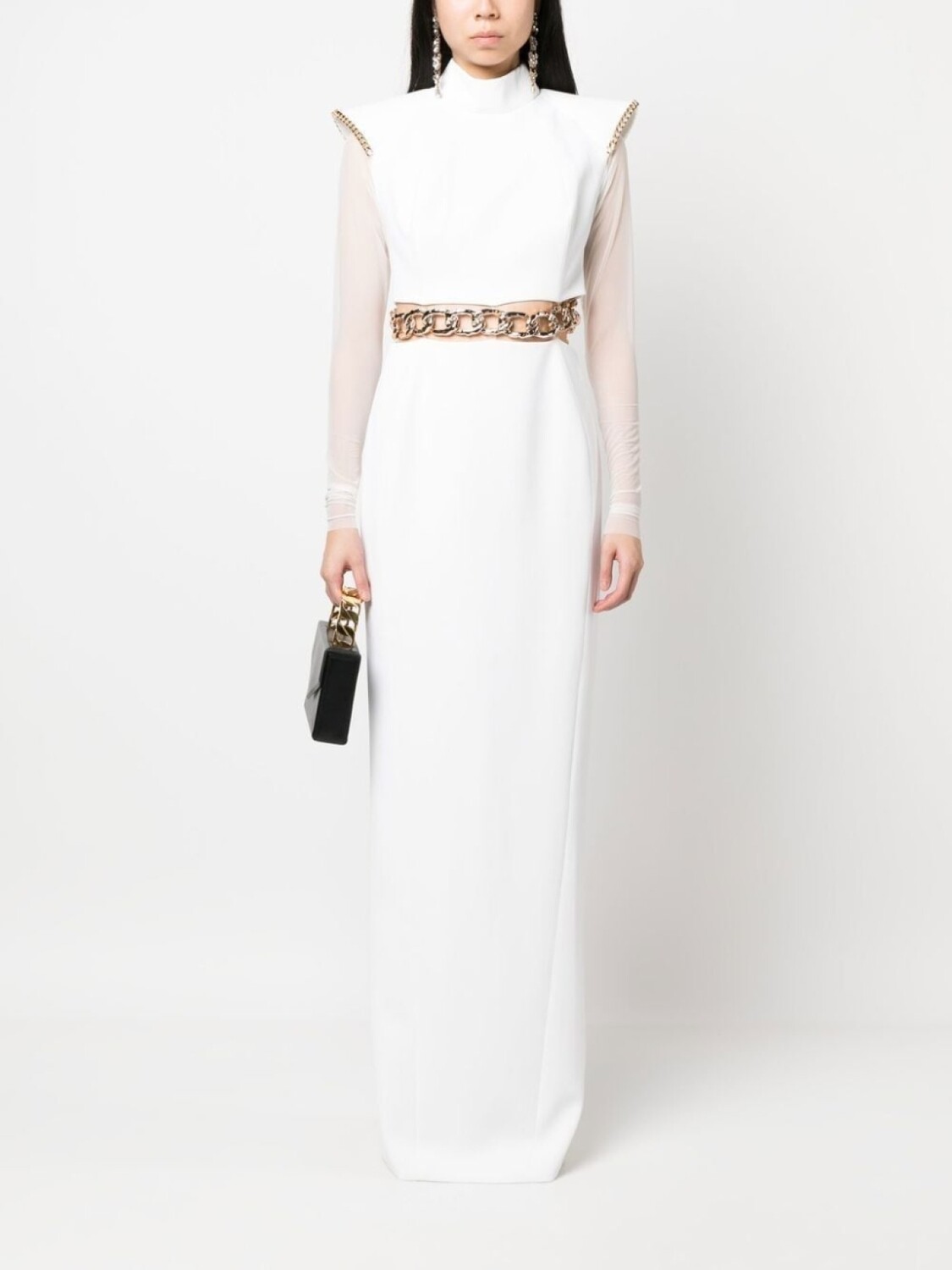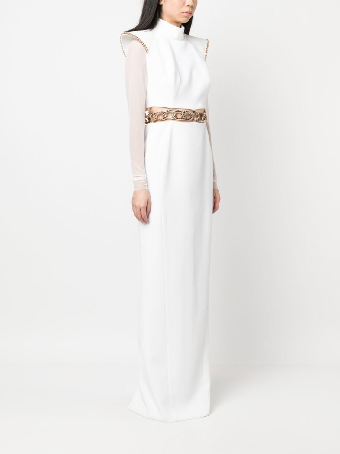 Цепочка, высокий воротник, длинные прозрачные рукава, длина макси и серебристая фурнитура.