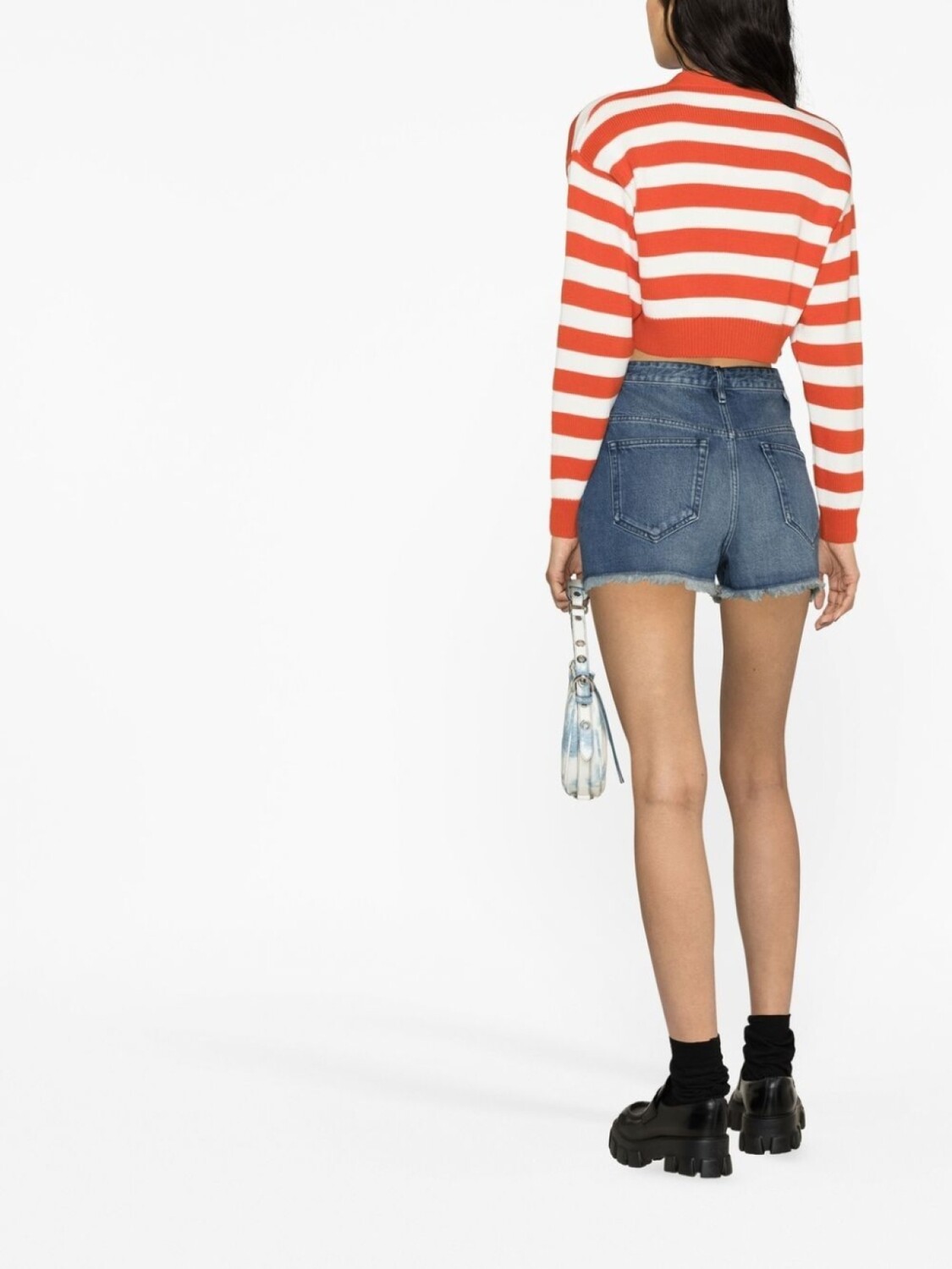 Узор в горизонтальную полоску, нашивка с логотипом спереди, застежка на пуговицах спереди, V-образный вырез, длинные рукава, укороченная длина, манжеты в рубчик и подол в рубчик.