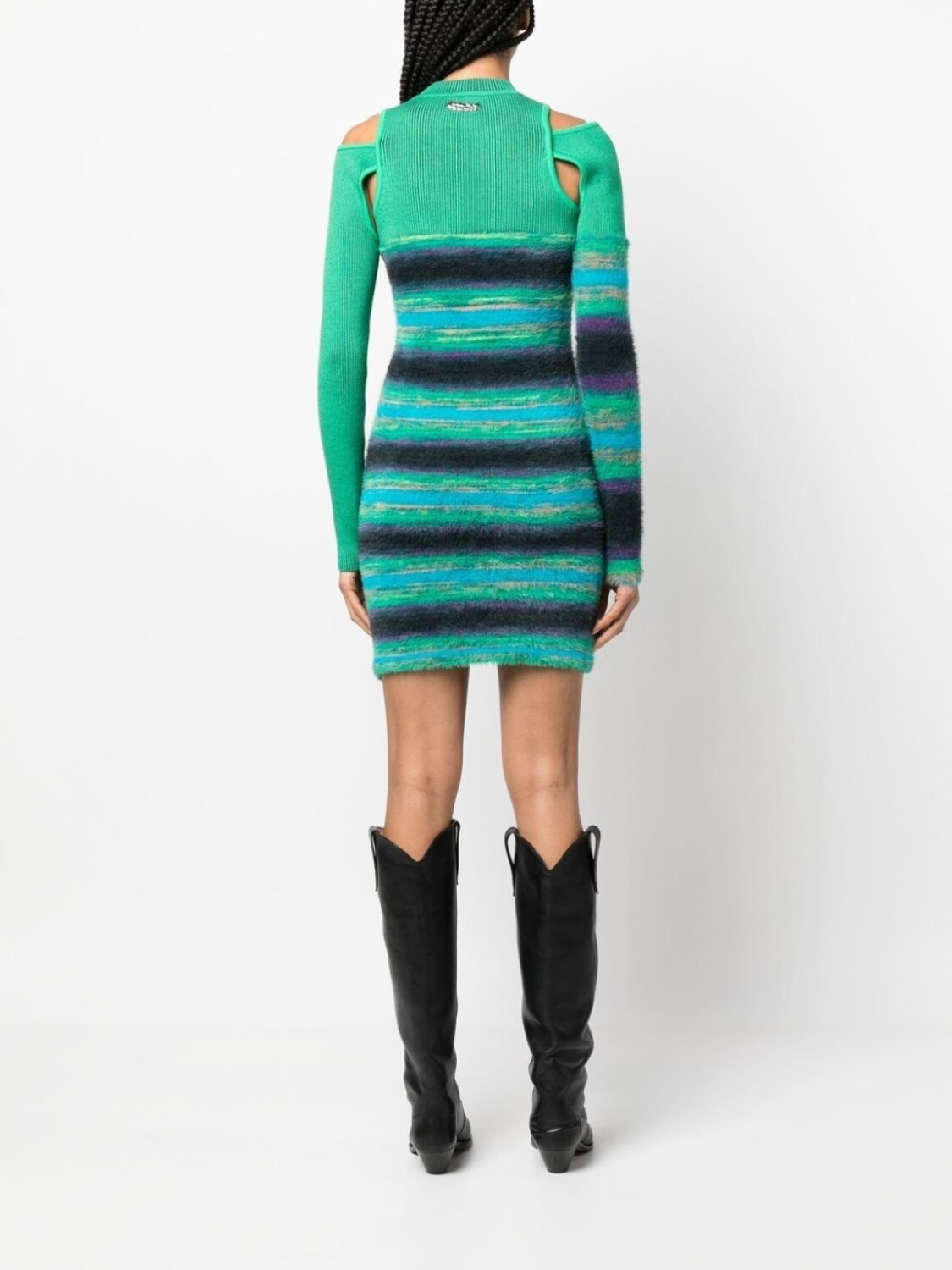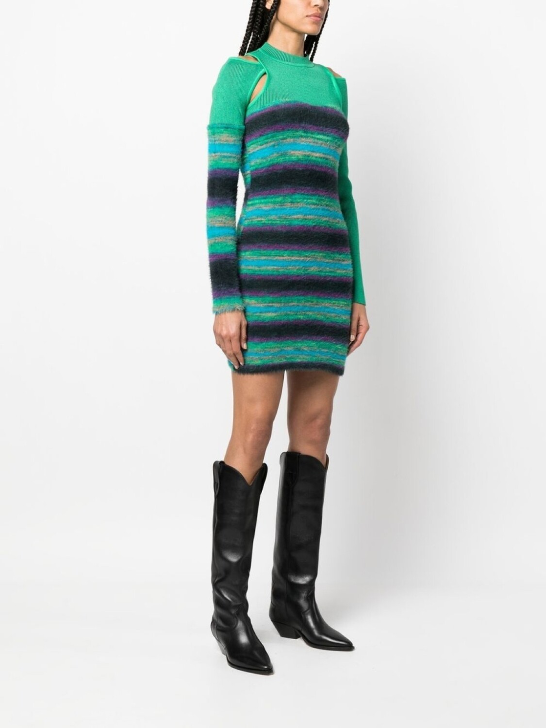 Зеленый, разноцветный, узор в горизонтальную полоску, вырезные детали, круглый вырез, длинные рукава, длина выше колена и прямой подол.