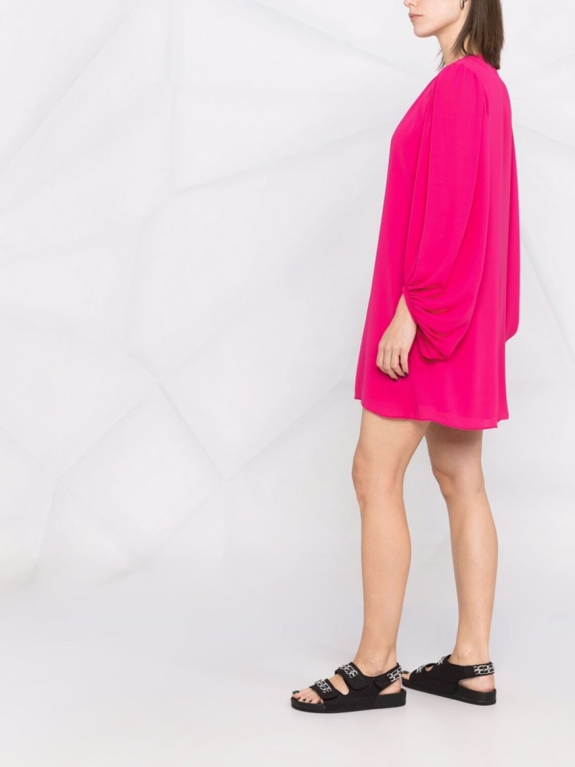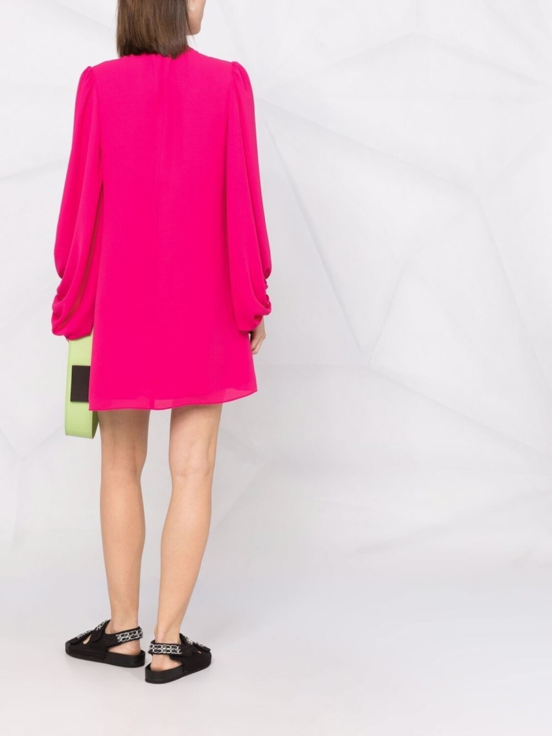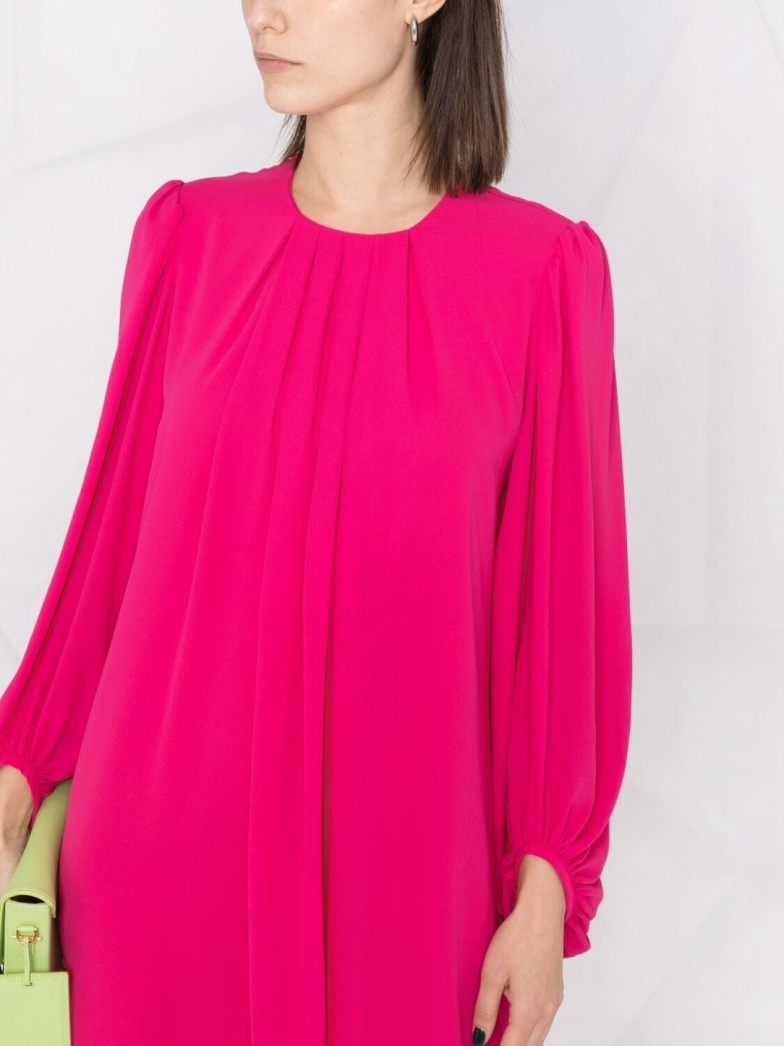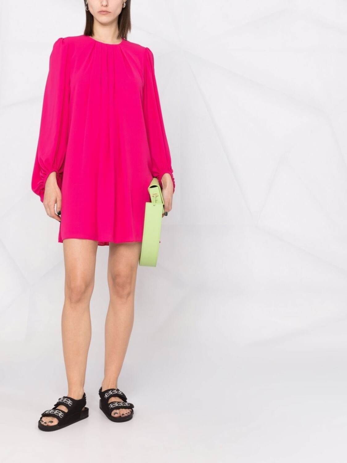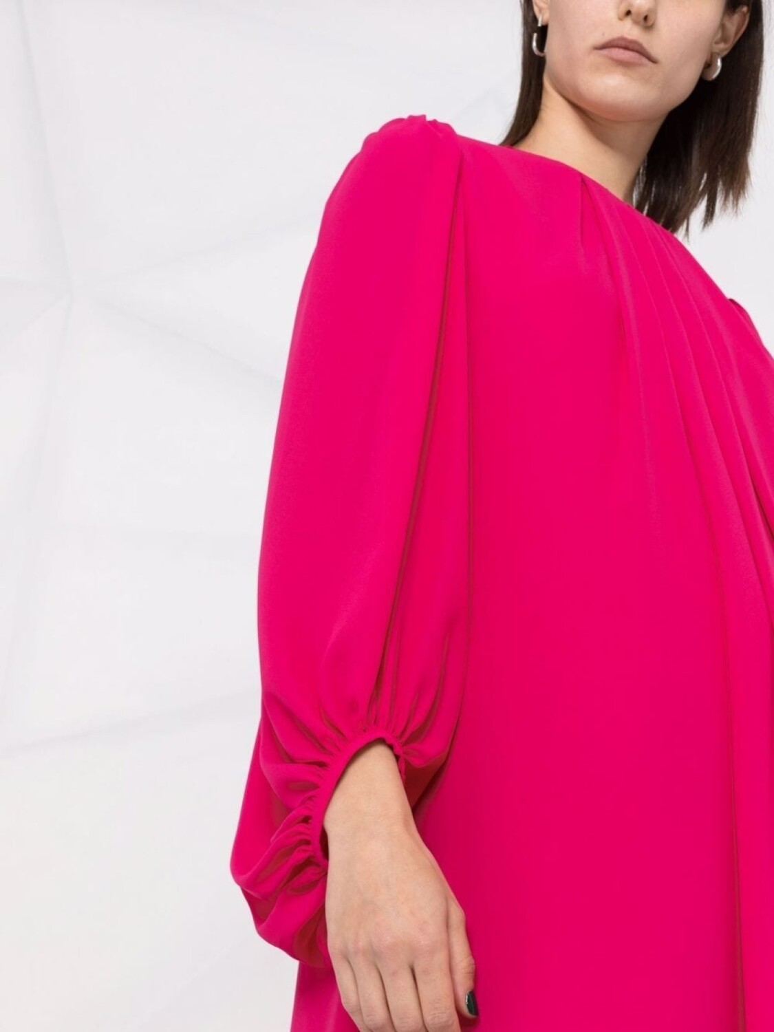 Силуэт трапеция, дизайн со сборками, круглый вырез, застежка на молнии сзади, объемные рукава, укороченные рукава и длина до бедер.