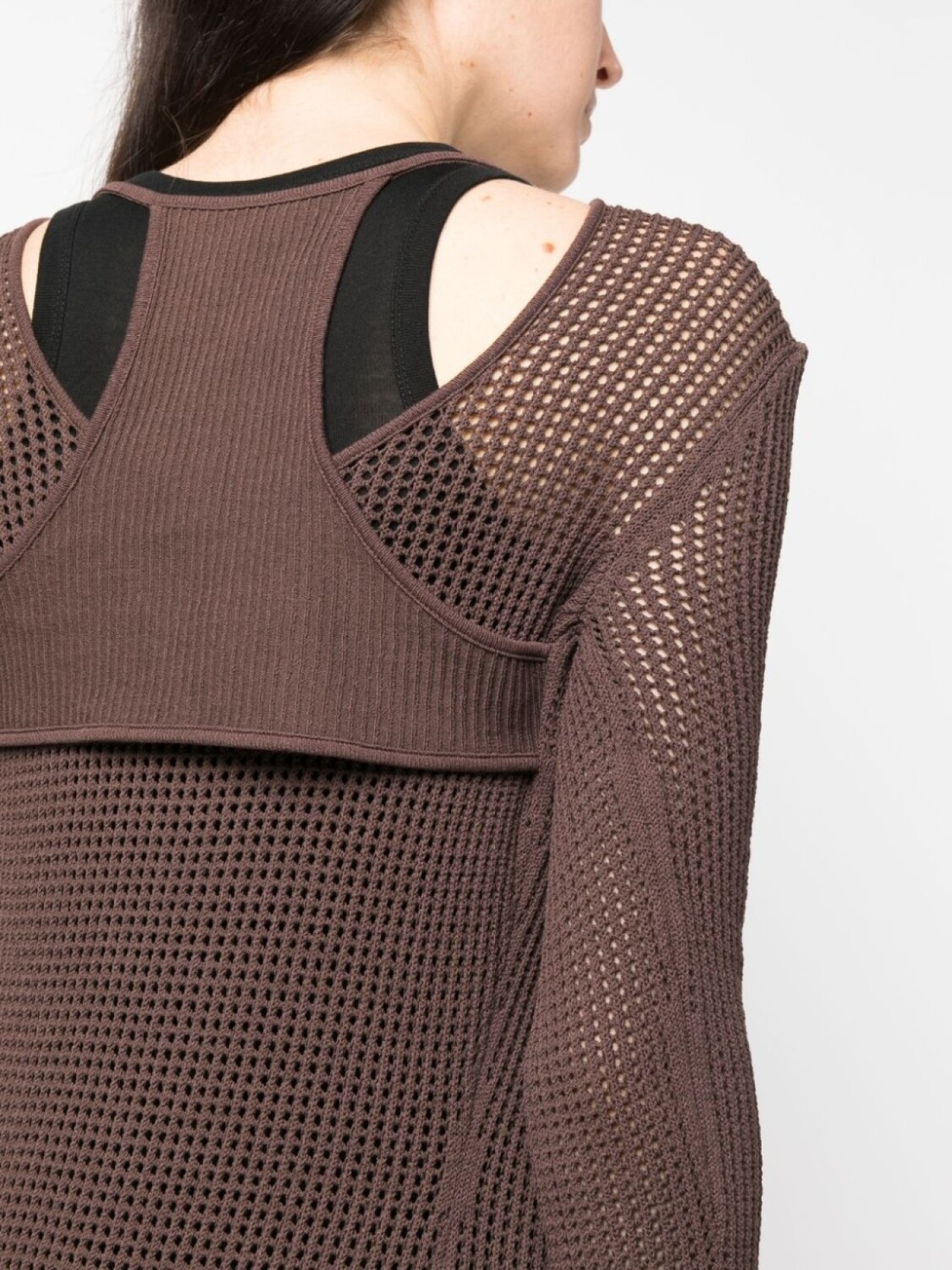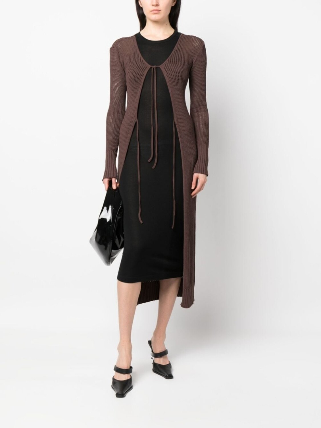 Шоколадный, ажурная вязка, трикотаж в рубчик, многослойная деталь, вырезные детали, U-образный вырез, завязки спереди, длинные рукава и длина до середины голени.
