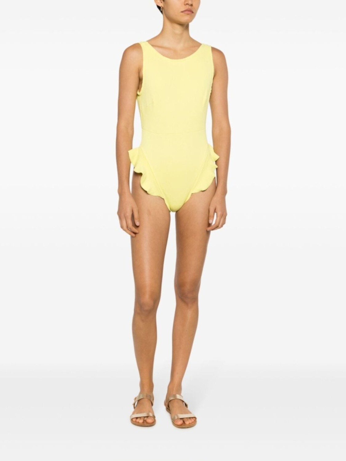 Лимонный, эластичный материал, вставки с оборками, круглый вырез, без рукавов и квадратный вырез на спине. Пожалуйста, примеряйте купальники и пляжные шорты только поверх собственного белья.