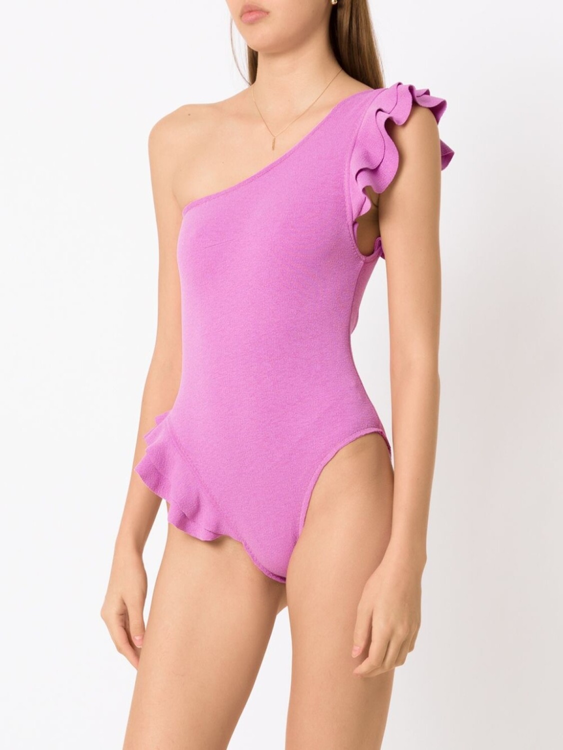Модель на одном плече, вставки с оборками, высокий вырез и эластичная модель.