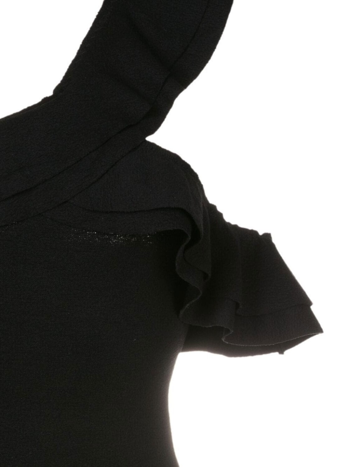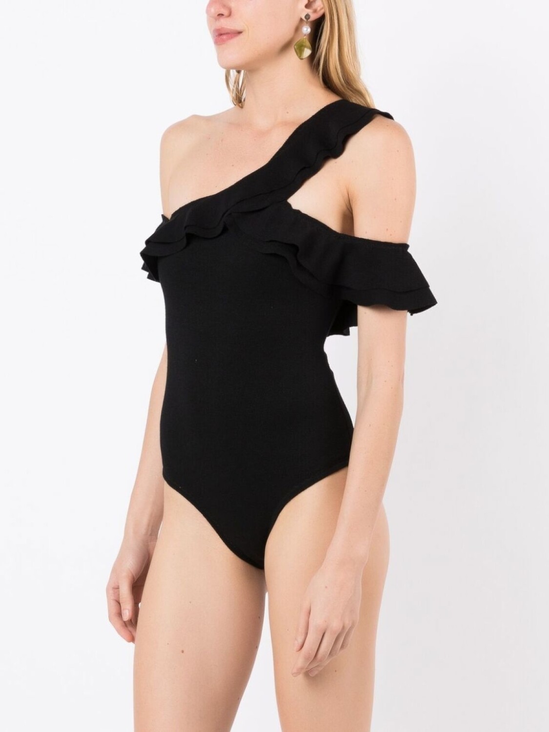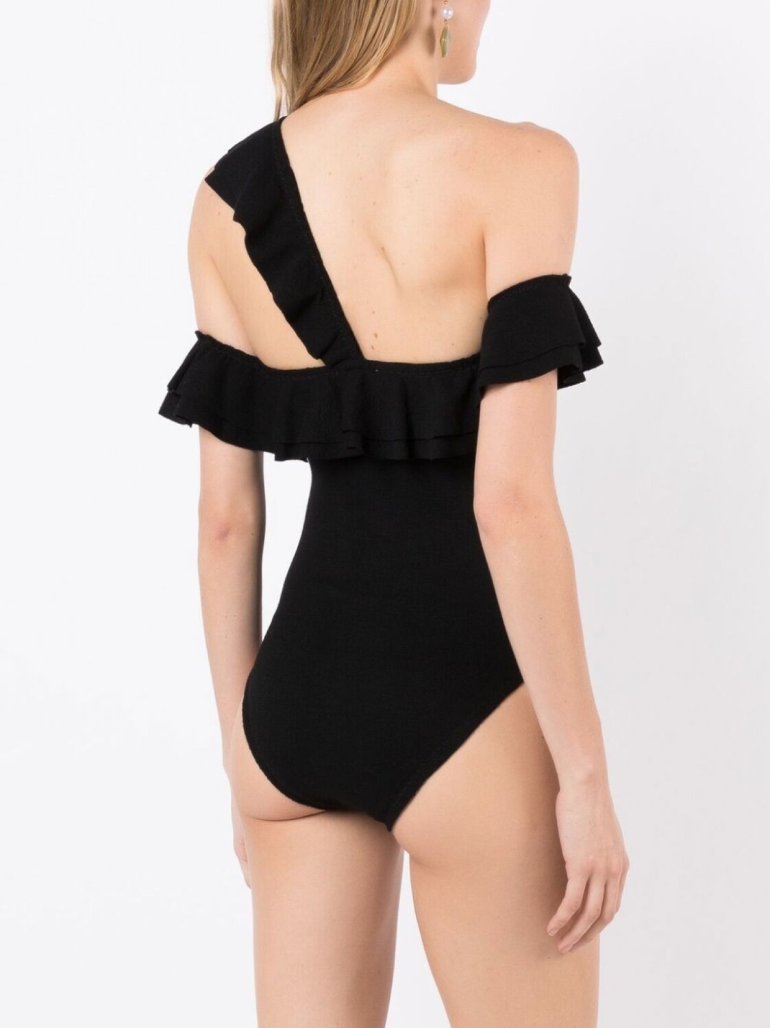 Черный, отделка с оборками, открытые плечи и эластичный материал. Пожалуйста, примеряйте купальники и пляжные шорты только поверх собственного белья.