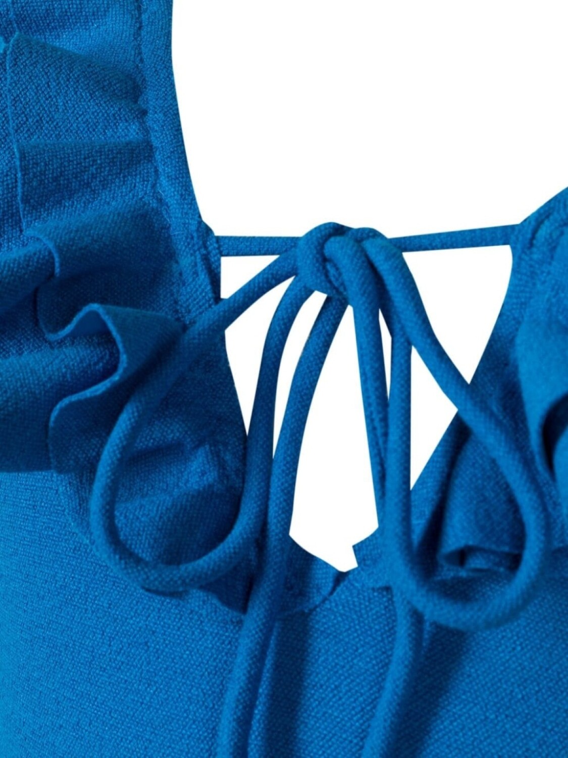 Кобальтово-синий, эластичный материал, вставки с оборками, завязки спереди, глубокий V-образный вырез и открытая спина. Пожалуйста, примеряйте купальники и пляжные шорты только поверх собственного белья.