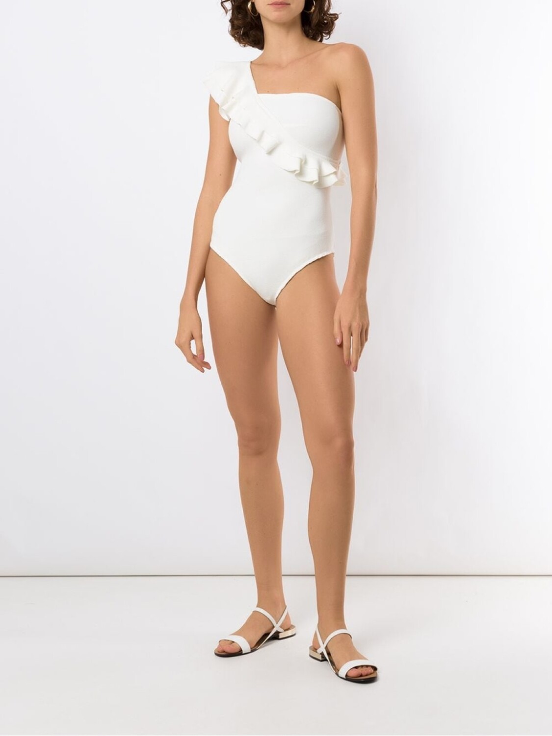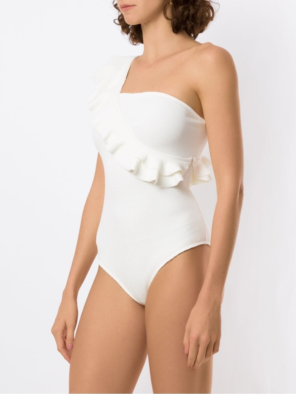 Купальник Siola с оборками от Clube Bossa. Прямой ворот, модель на одном плече, открытая спина, эластичная отделка и фактурная модель. Цвет: белый. Размер этой модели соответствует стандарту.