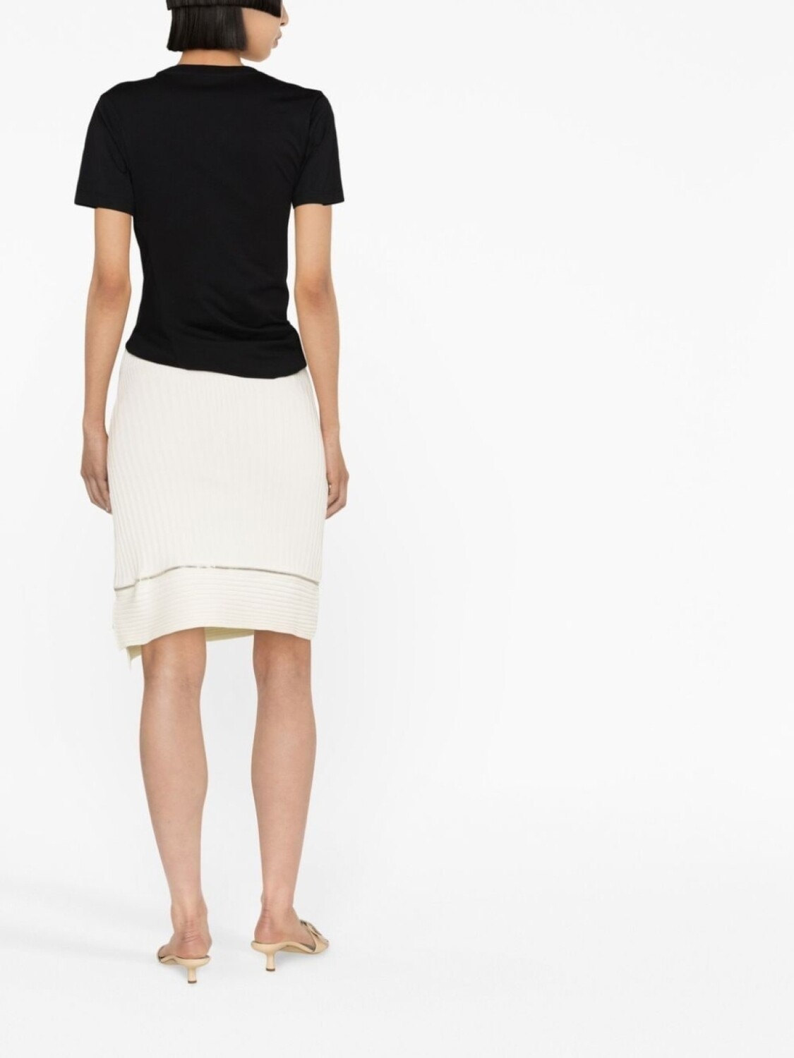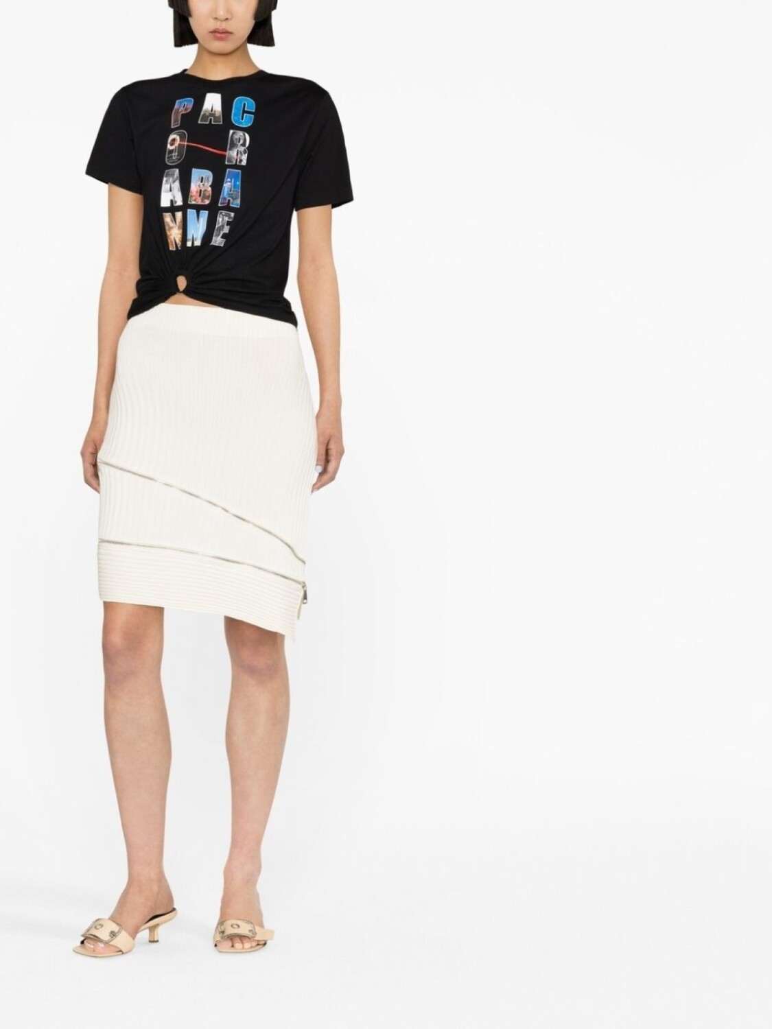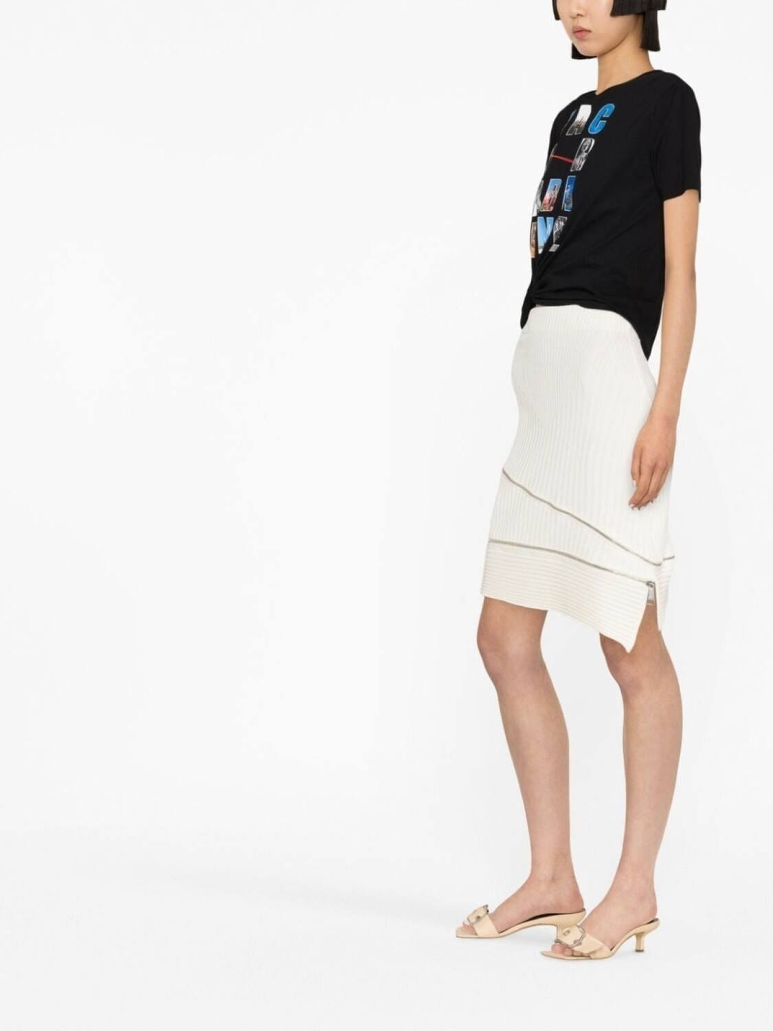 Цвет слоновой кости, эластичный материал, ткань в мелкий рубчик, отделка с декоративной молнией, завышенная талия и асимметричный подол.