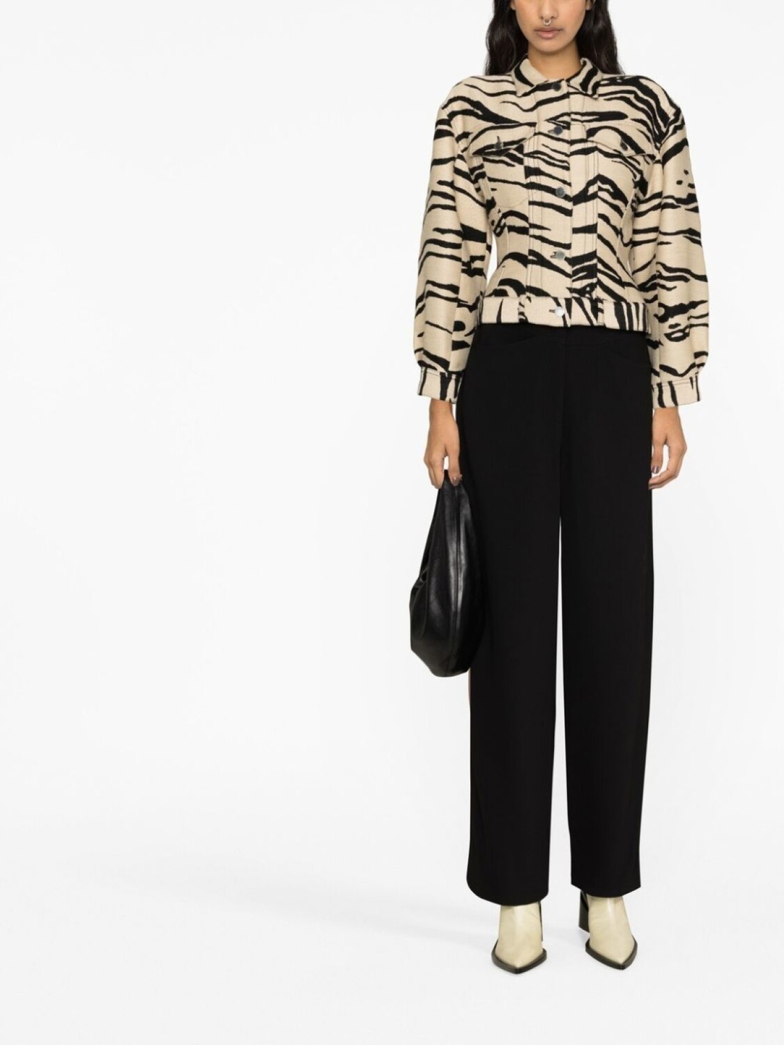 Черный, смесовая необработанная шерсть, завышенная талия, петли для ремня, застежка на молнии и пуговице спереди, два накладных кармана спереди и прямой крой.
