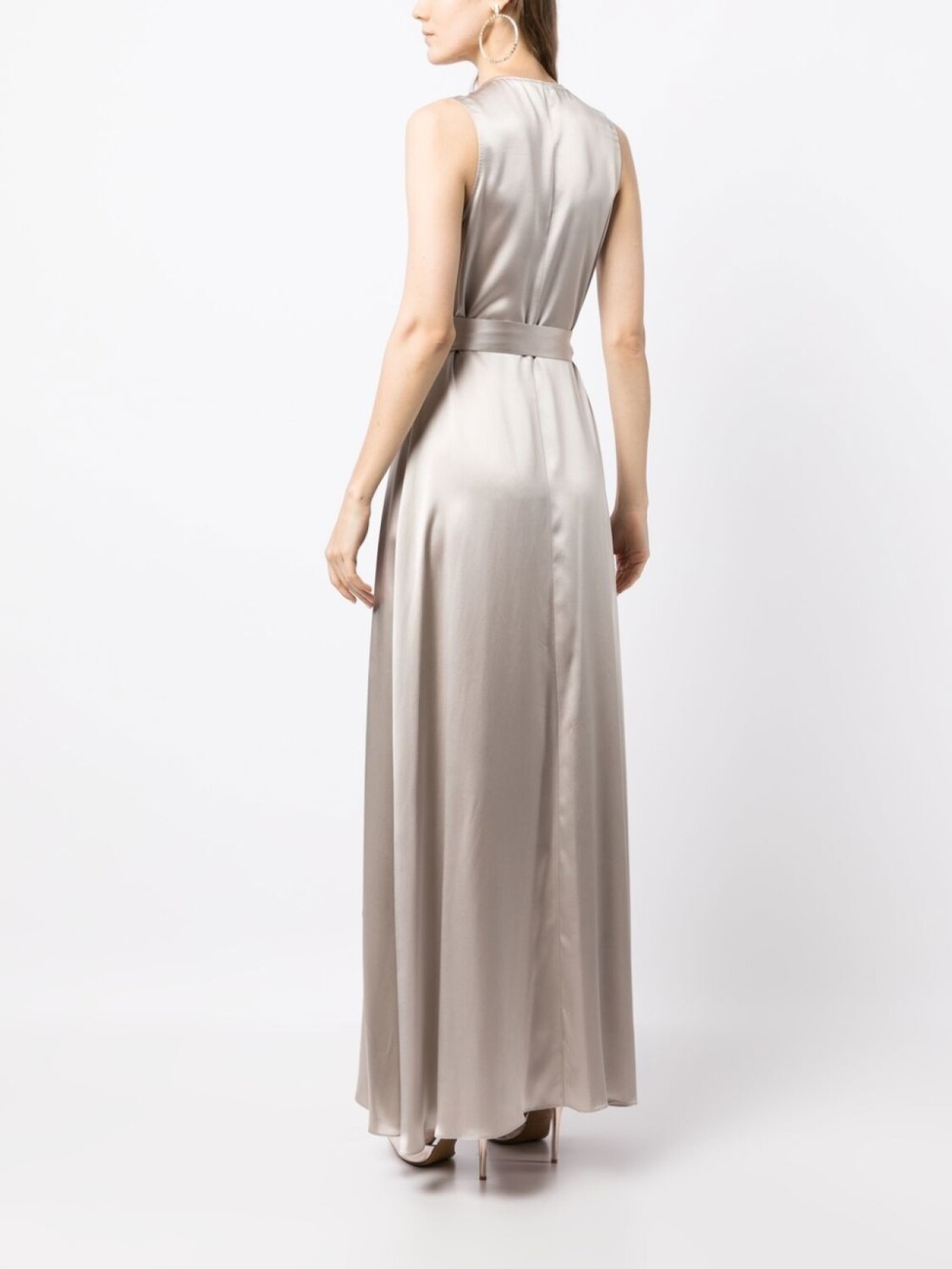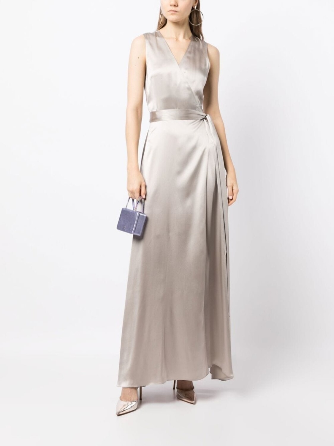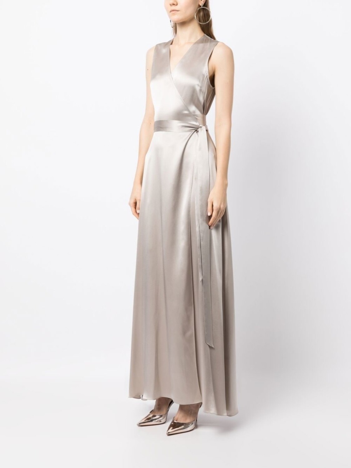 Серебристый, шелк, сатиновая фактура, модель на запах, V-образный вырез, завязки по бокам, без рукавов и длинная модель.