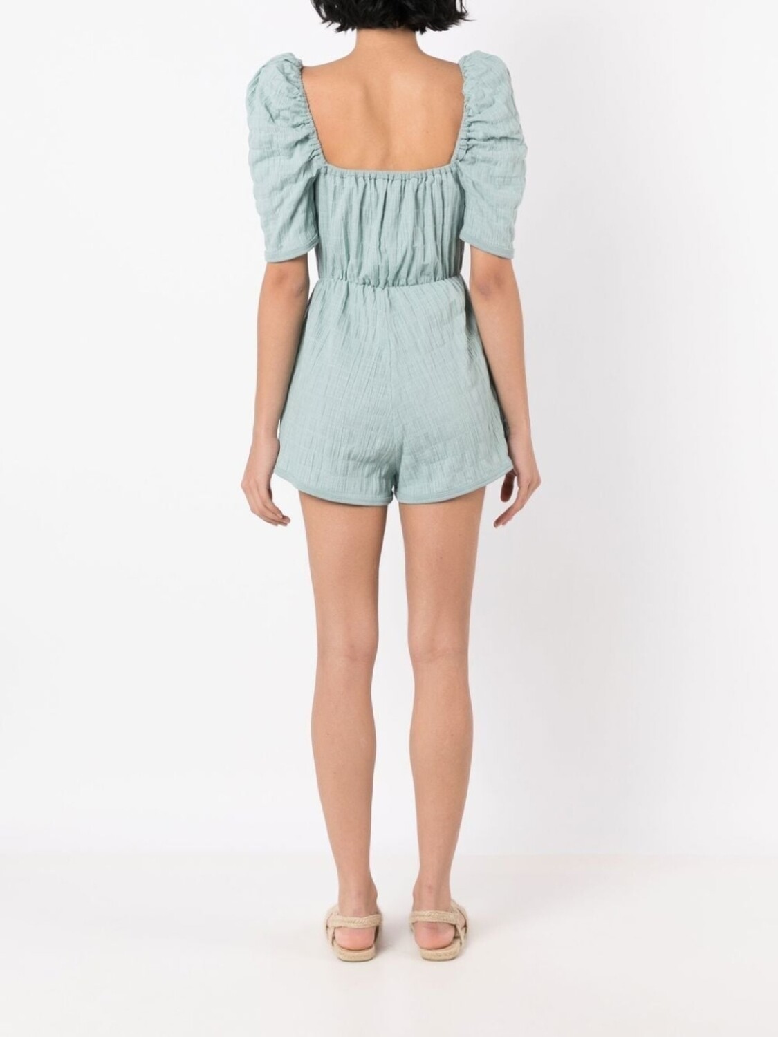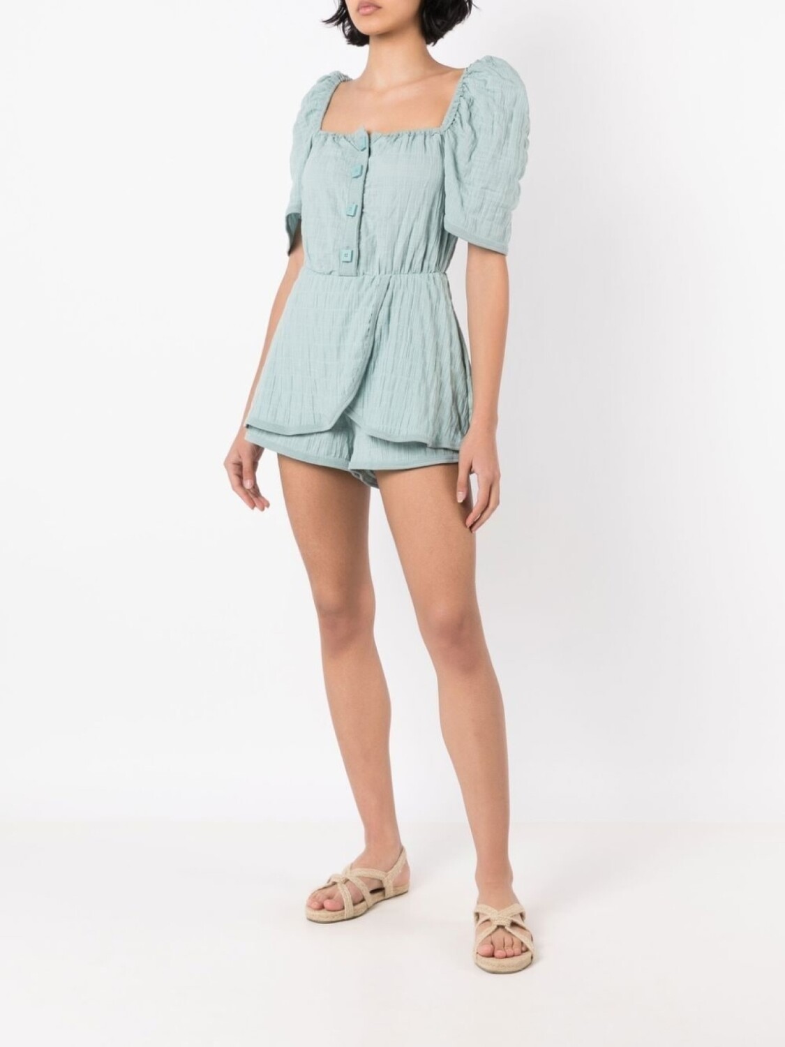 Сине-зеленый, хлопок, драпировка, квадратный вырез, планка на пуговицах спереди, короткие объемные рукава и два прорезных кармана по бокам.
