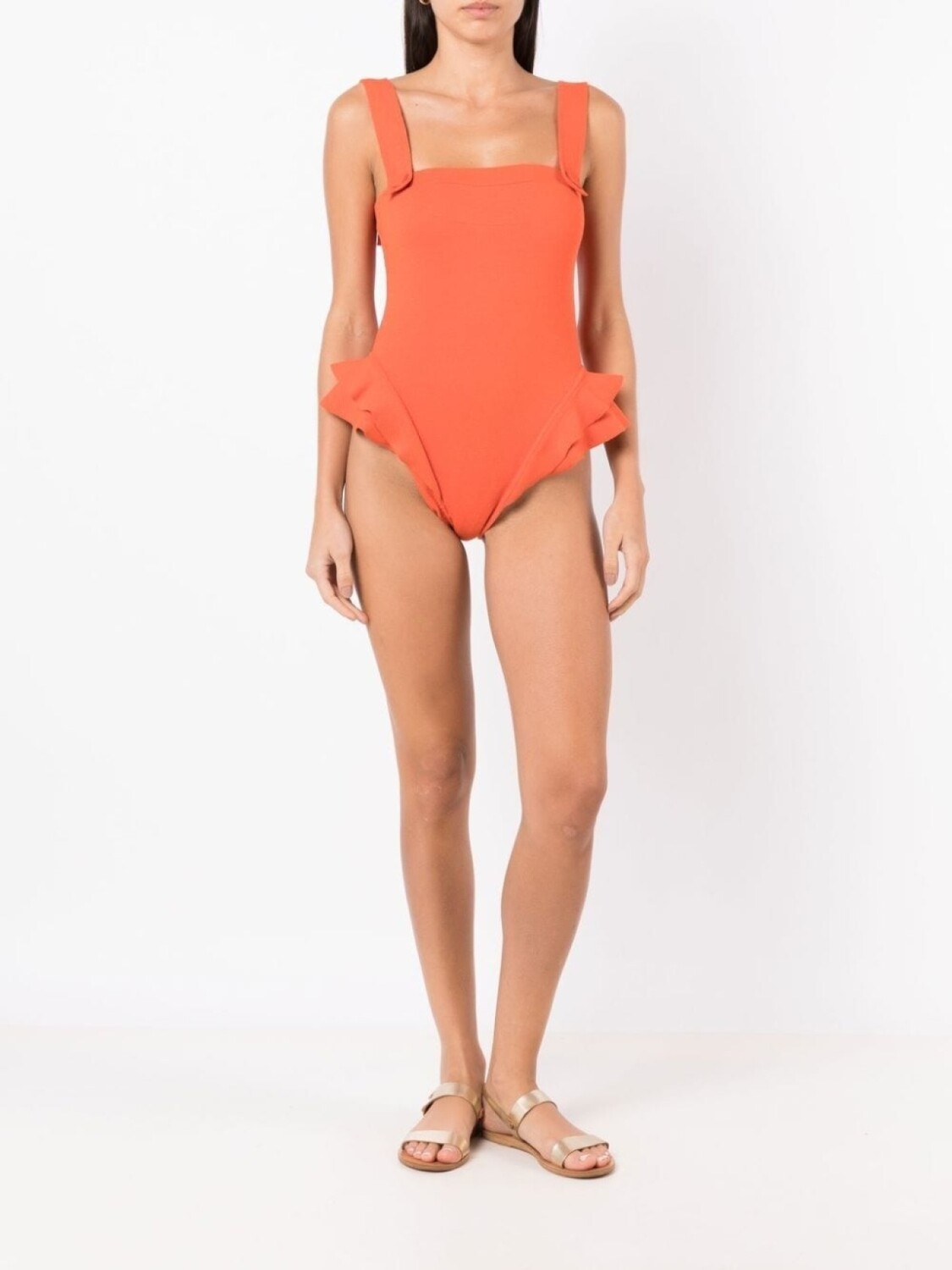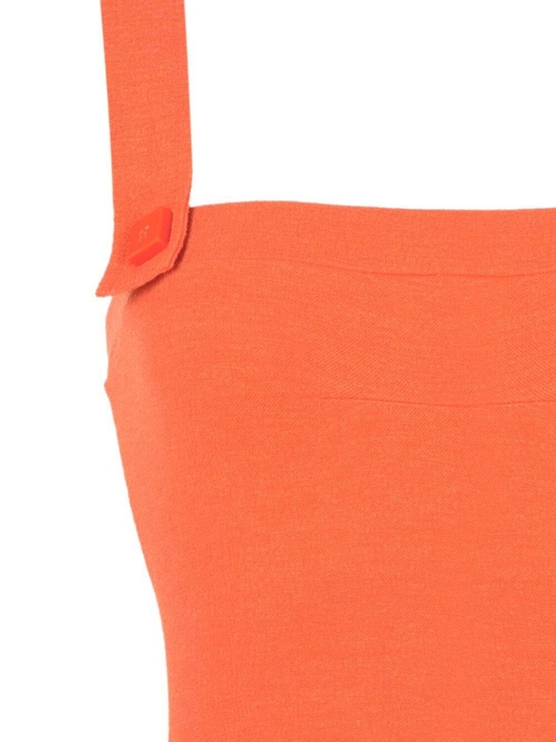 Мандариново-оранжевый, эластичный материал, квадратный вырез, тонкий ремень, присборенный воротник и среднее покрытие. Пожалуйста, примеряйте купальники и пляжные шорты только поверх собственного белья.