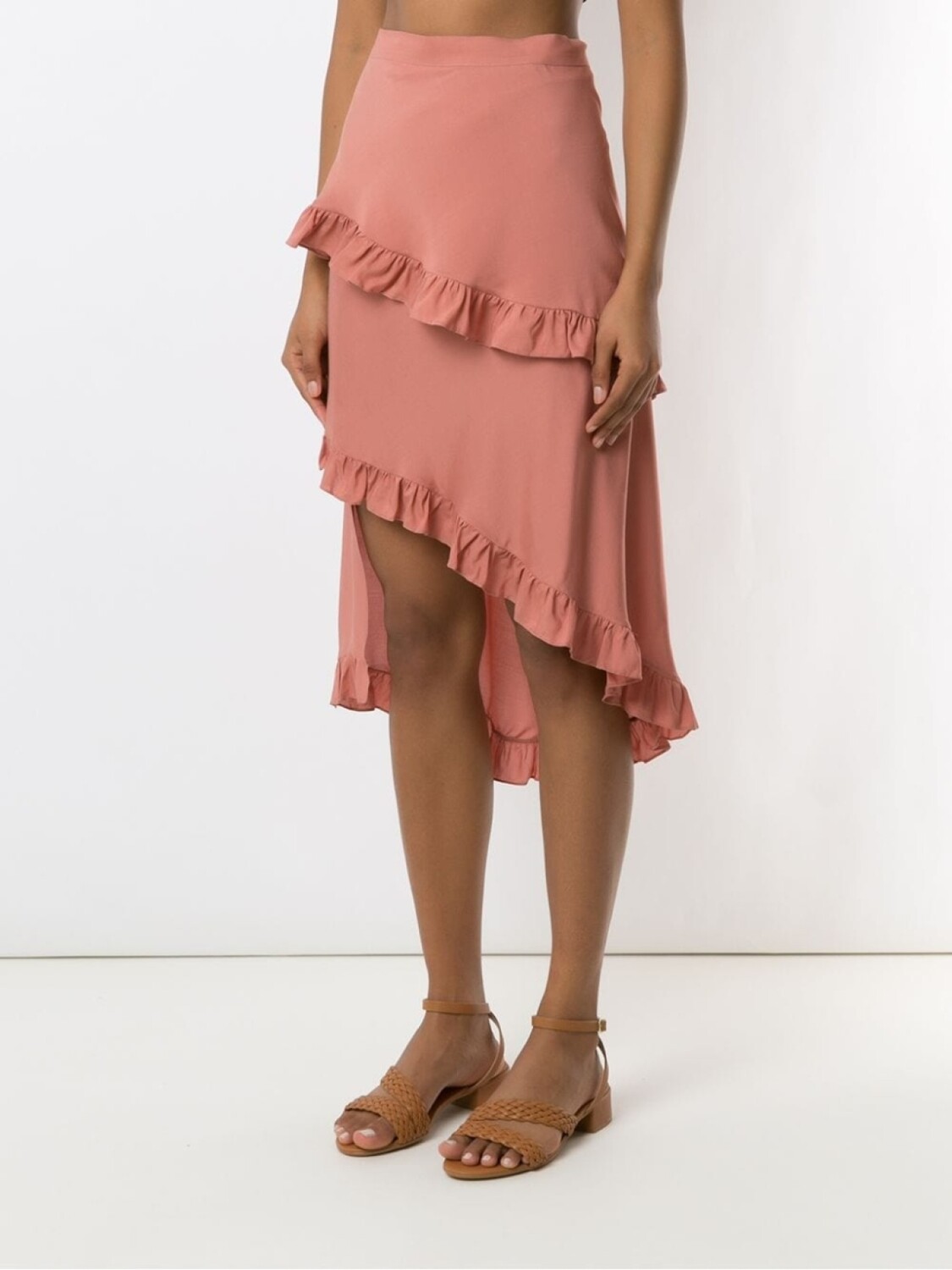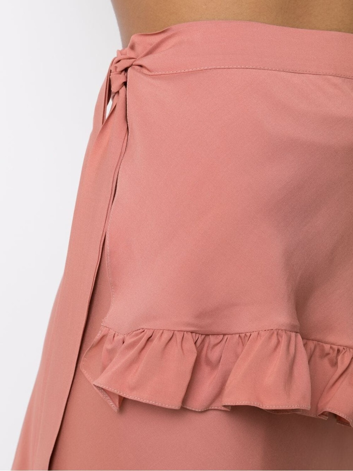 Асимметричная юбка, отделка с оборками, завязки по бокам и длина миди.