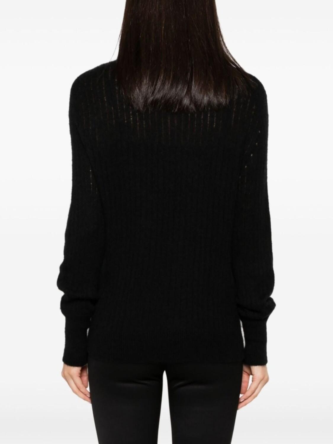 Черный, смесь кашемира и шелка, трикотаж в рубчик, серебристый металлический логотип, высокий воротник, заниженная линия плеч, длинные рукава, подол и манжеты в рубчик, прямой подол