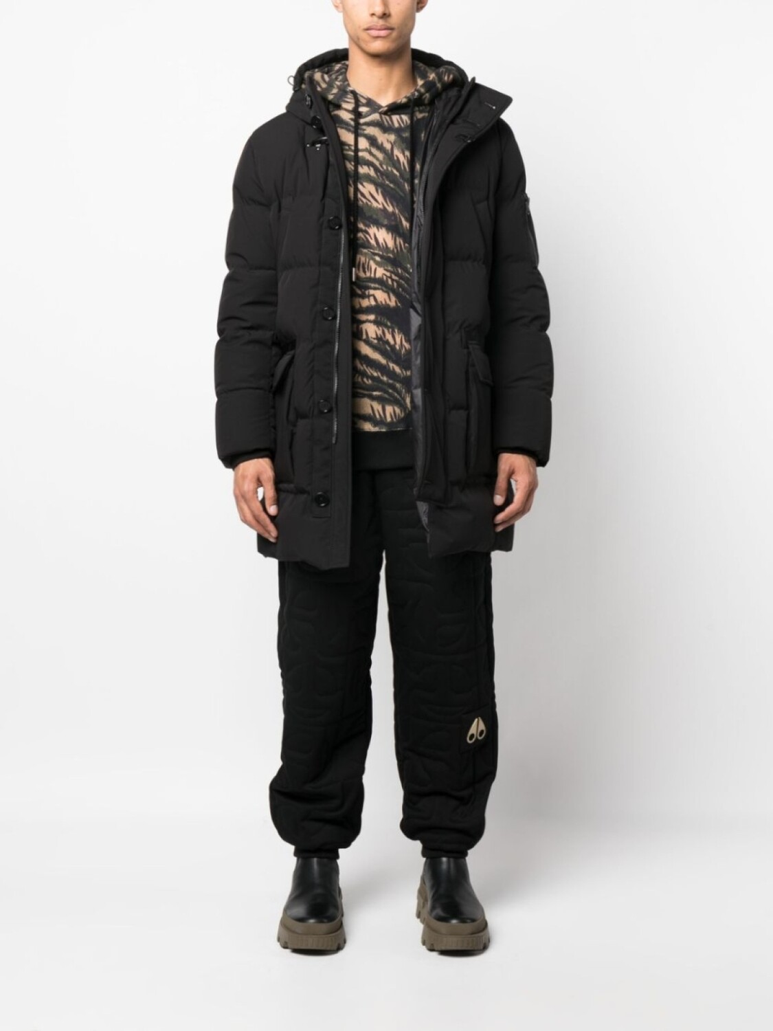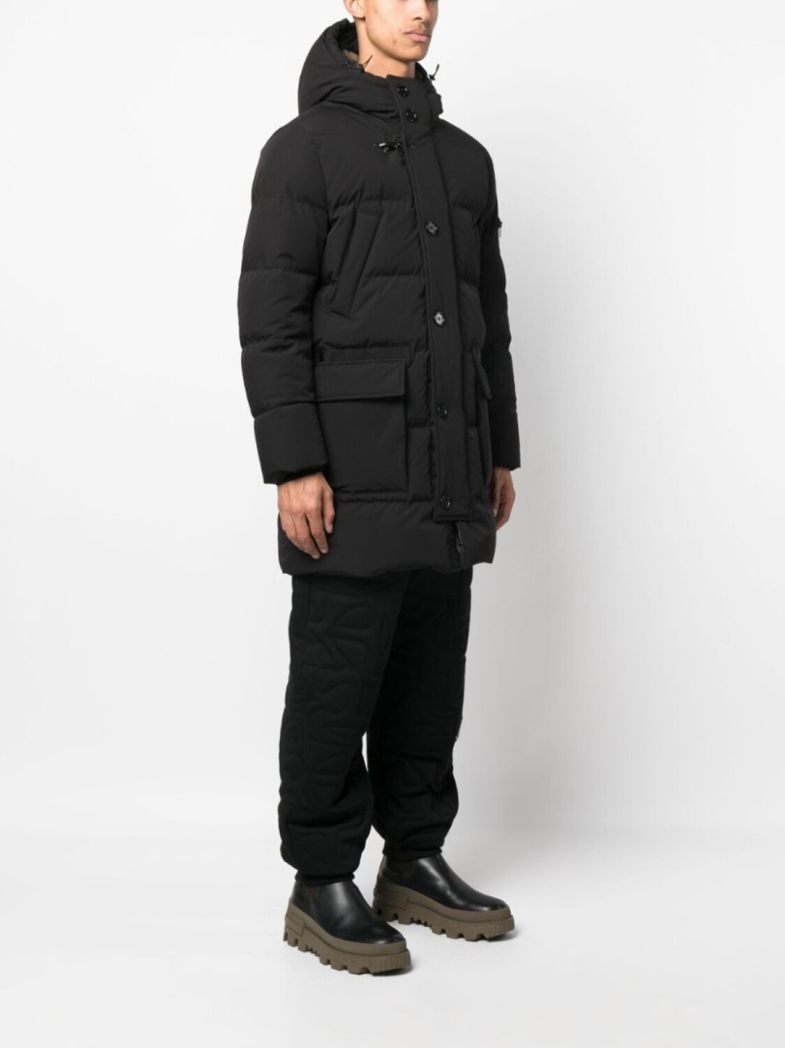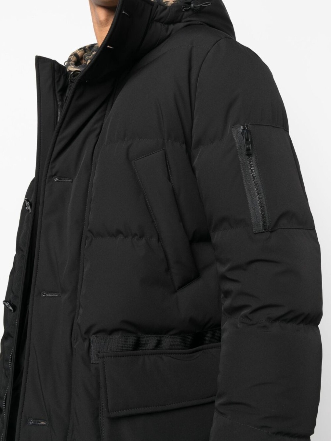 Черный, наполнитель из смеси пуха и пера, дутый материал, затягивающийся на шнурок капюшон, воротник-труба, застежка на пуговицах спереди, потайная молния спереди, два нагрудных кармана с листочкой, два передних кармана с клапанами, карман с молнией на рукаве, длинные рукава, эластичные манжеты и прямой подол.