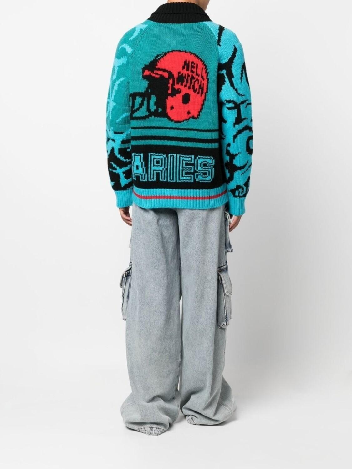 Бирюзовый, черный, красный, смесовая шерсть, логотип в технике интарсия, графичный принт на спине, застежка на молнии спереди, воротник-стойка в рубчик, длинные рукава, прорезные карманы по бокам и отделка в рубчик. Ответственный выбор: Этот товар как минимум на 50% состоит из переработанных или повторно использованных материалов.