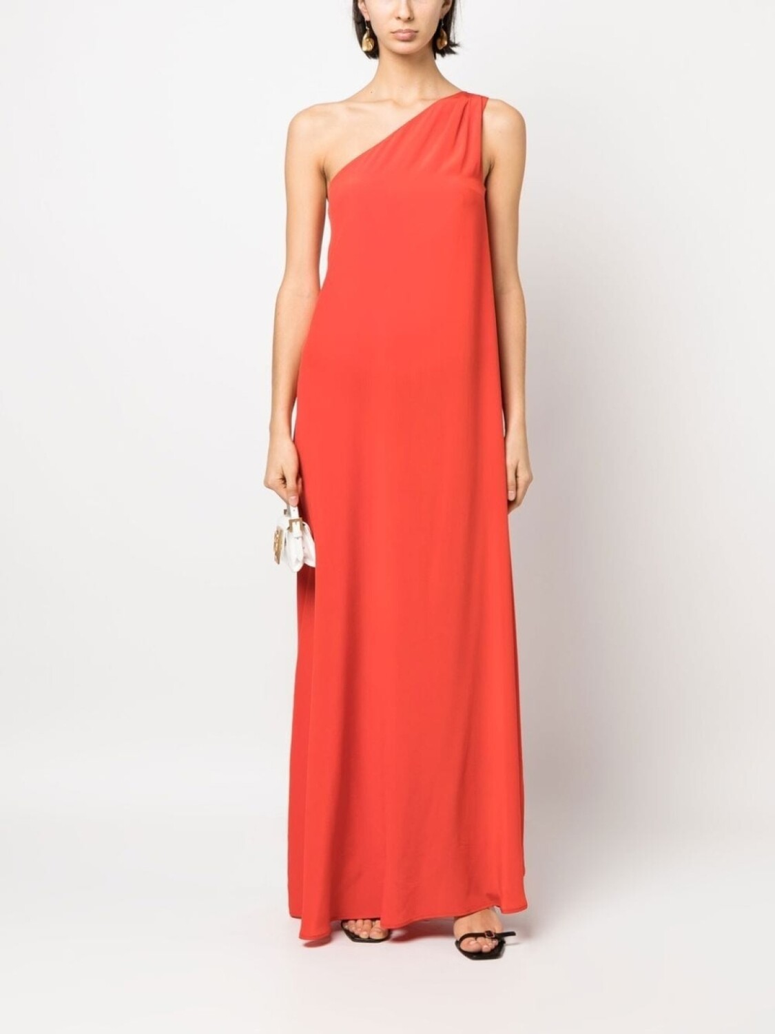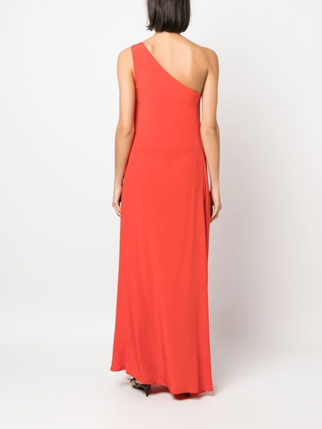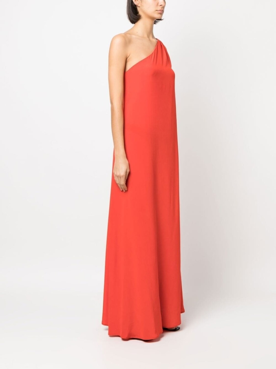 Красный, шелк, модель на одном плече, асимметричный вырез, асимметричный подол, без рукавов и высота по щиколотку.